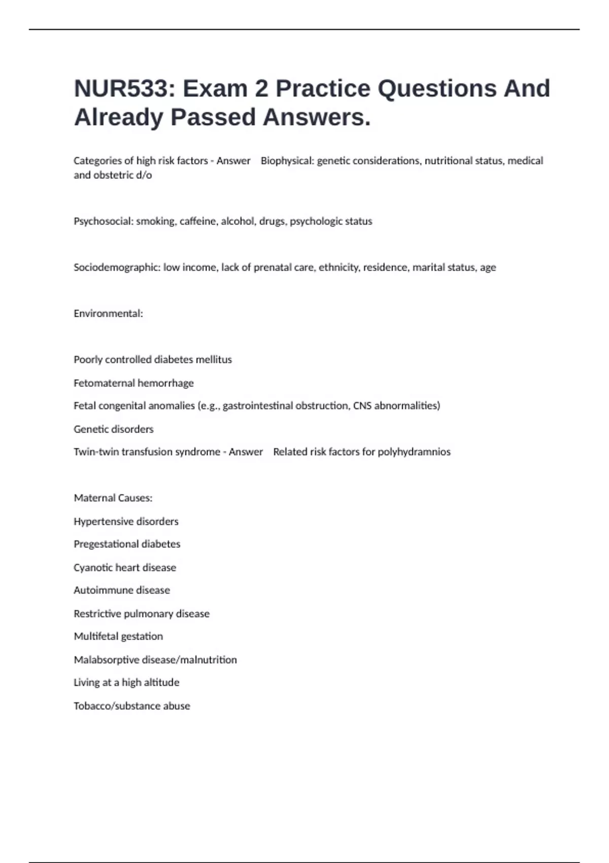 Categories of high risk factors - Answer Biophysical: genetic considerations, nutritional status, medical