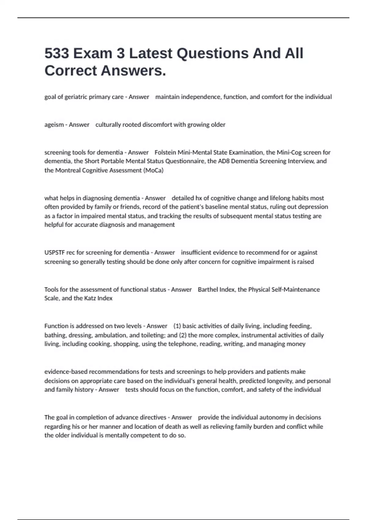 goal of geriatric primary care - Answer maintain independence, function, and comfort for the individual ageism - Answer culturally rooted discomfort with growing older screening tools for dementia - Answer Folstein Mini-Mental State Examination, the Mini-Cog screen for dementia, the Short Portable Mental Status Questionnaire, the AD8 Dementia Screening Interview, and the Montreal Cognitive Assessment (MoCa) what helps in diagnosing dementia - Answer detailed hx of cognitive change and lifelong habits most often provided by family or friends, record of the patient's baseline mental status, ruling out depression as a factor in impaired mental status, and tracking the results of subsequent mental status testing are helpful for accurate diagnosis and management USPSTF rec for screening for dementia - Answer insufficient evidence to recommend for or against screening so generally testing should be done only after concern for cognitive impairment is raised Tools for the assessment of functional status - Answer Barthel Index, the Physical Self-Maintenance Scale, and the Katz Index Function is addressed on two levels - Answer (1) basic activities of daily living, including feeding, bathing, dressing, ambulation, and toileting; and (2) the more complex, instrumental activities of daily living, including cooking, shopping, using the telephone, reading, writing, and managing money evidence-based recommendations for tests and screenings to help providers and patients make decisions on appropriate care based on the individual's general health, predicted longevity, and personal and family history - Answer tests should focus on the function, comfort, and safety of the individual The goal in completion of advance directives - Answer provide the individual autonomy in decisions regarding his or her manner and location of death as well as relieving family burden and conflict while the older individual is mentally competent to do so.