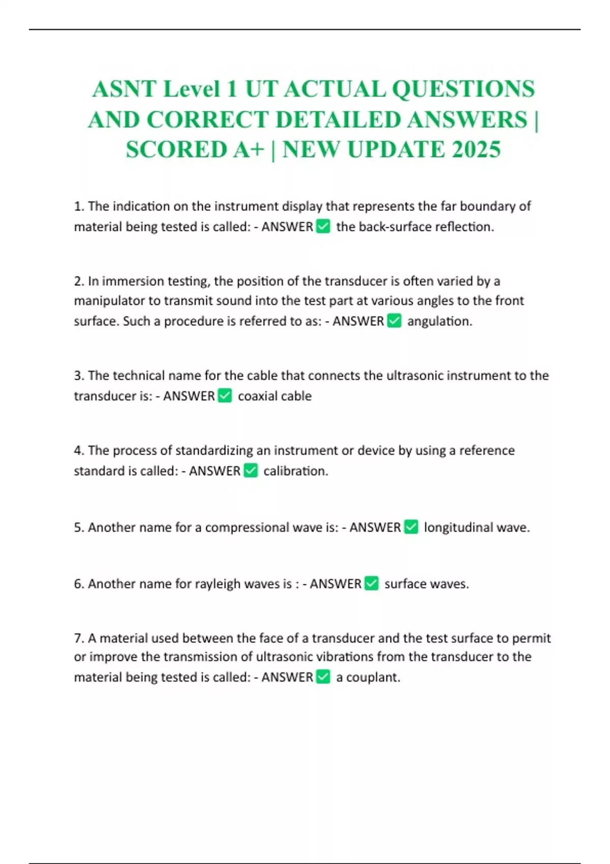 ASNT Level 1 UT ACTUAL QUESTIONS AND CORRECT DETAILED ANSWERS | SCORED A+ | NEW UPDATE 2025