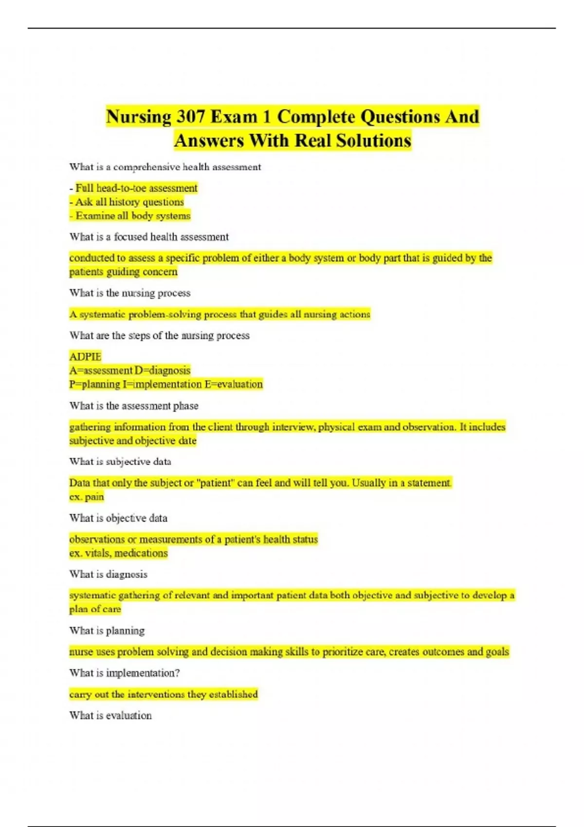 Nursing 307 Exam 1 Complete Questions And Answers With Real Solutions What is a comprehensive health assessment - Full head-to-toe assessment - Ask all history questions - Examine all body systems What is a focused health assessment conducted to assess a specific problem of either a body system or body part that is guided by the patients guiding concern What is the nursing process A systematic problem-solving process that guides all nursing actions What are the steps of the nursing process ADPIE A=assessment D=diagnosis P=planning I=implementation E=evaluation