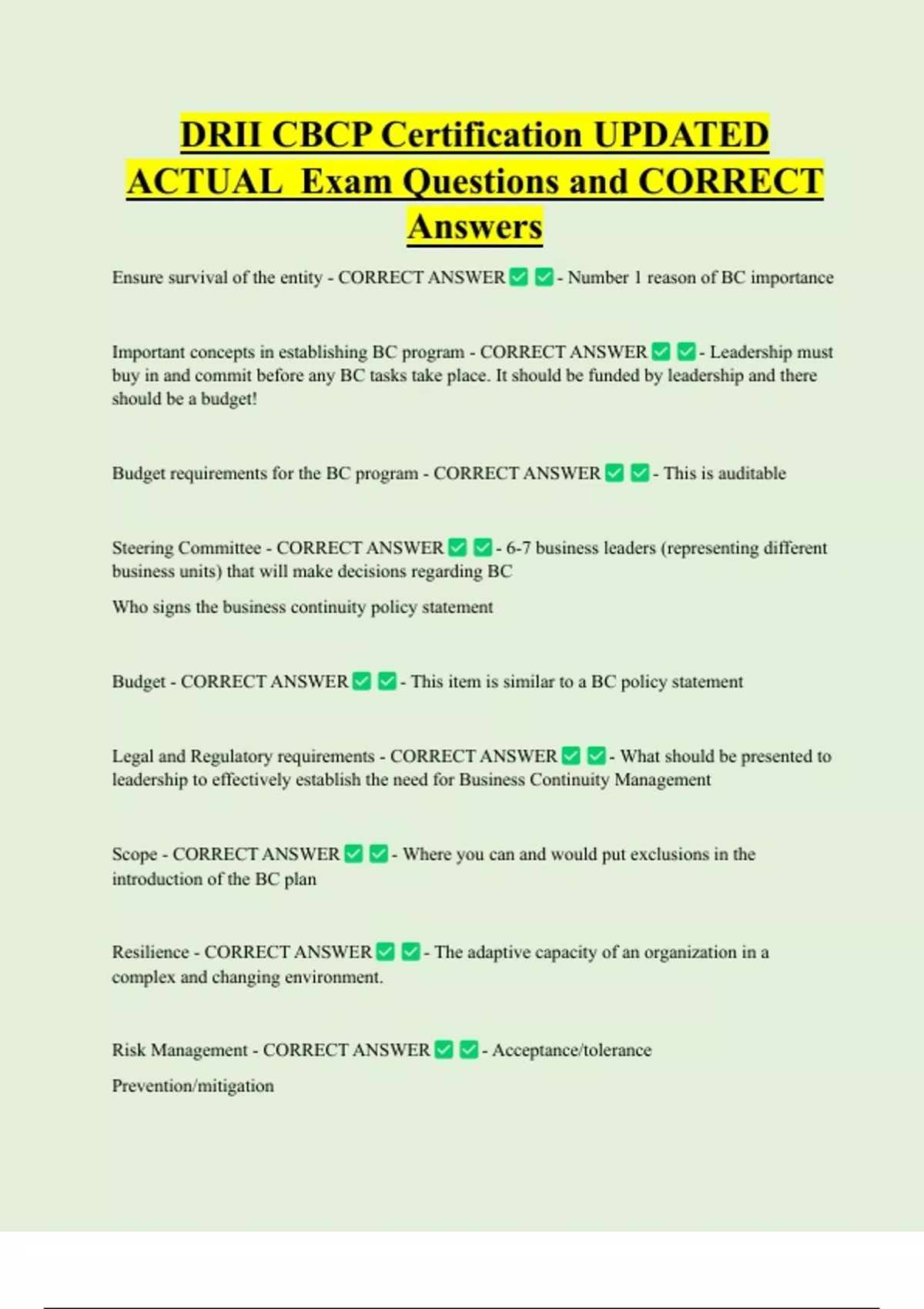 DRII CBCP Certification UPDATED ACTUAL Exam Questions and CORRECT Answers Ensure survival of the entity - CORRECT ANSWER - Number 1 reason of BC importance Important concepts in establishing BC program - CORRECT ANSWER - Leadership must buy in and commit before any BC tasks take place. It should be funded by leadership and there should be a budget! Budget requirements for the BC program - CORRECT ANSWER - This is auditabl