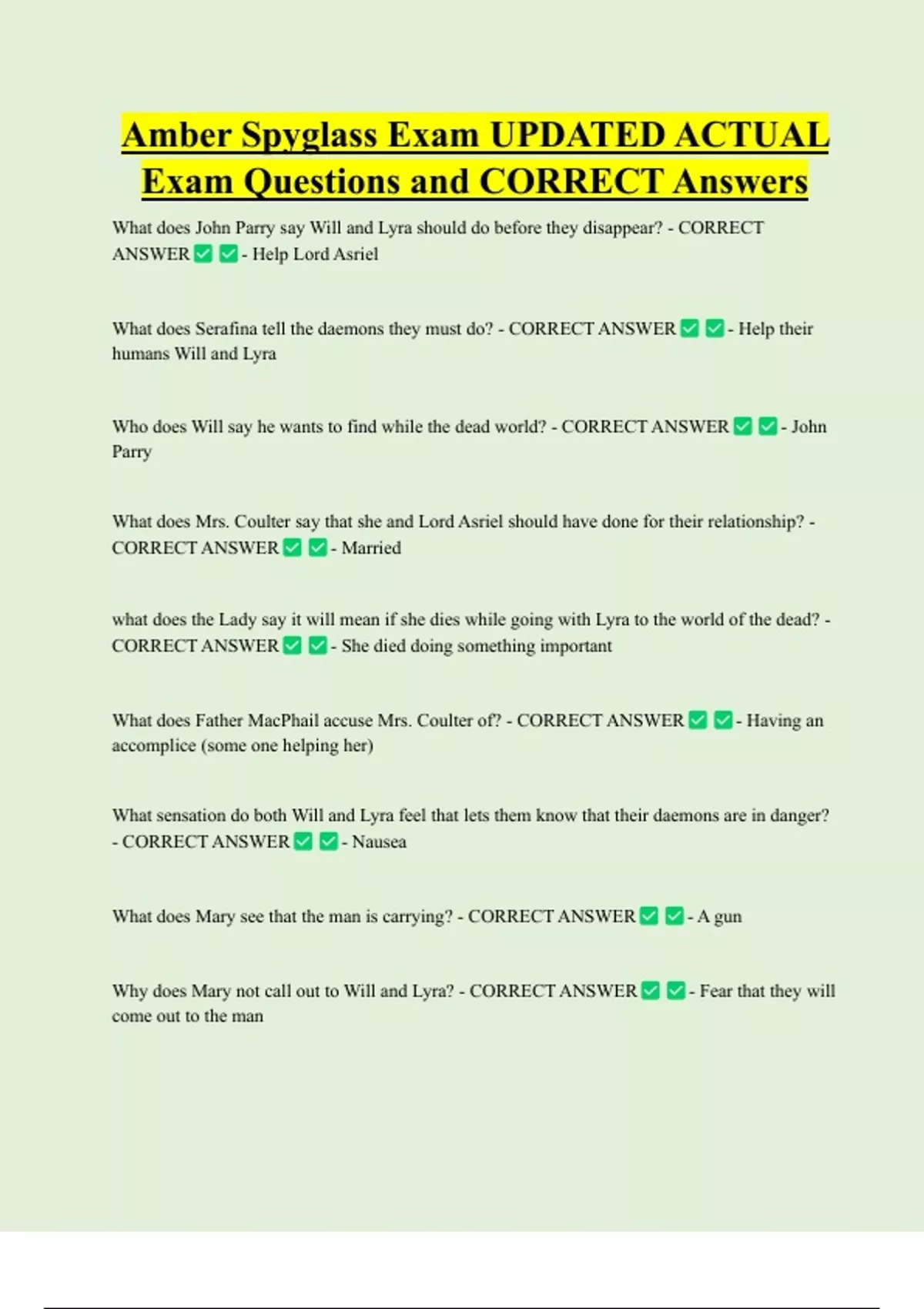 Amber Spyglass Exam UPDATED ACTUAL Exam Questions and CORRECT Answers What does John Parry say Will and Lyra should do before they disappear? - CORRECT ANSWER - Help Lord Asriel What does Serafina tell the daemons they must do? - CORRECT ANSWER - Help their humans Will and Lyra