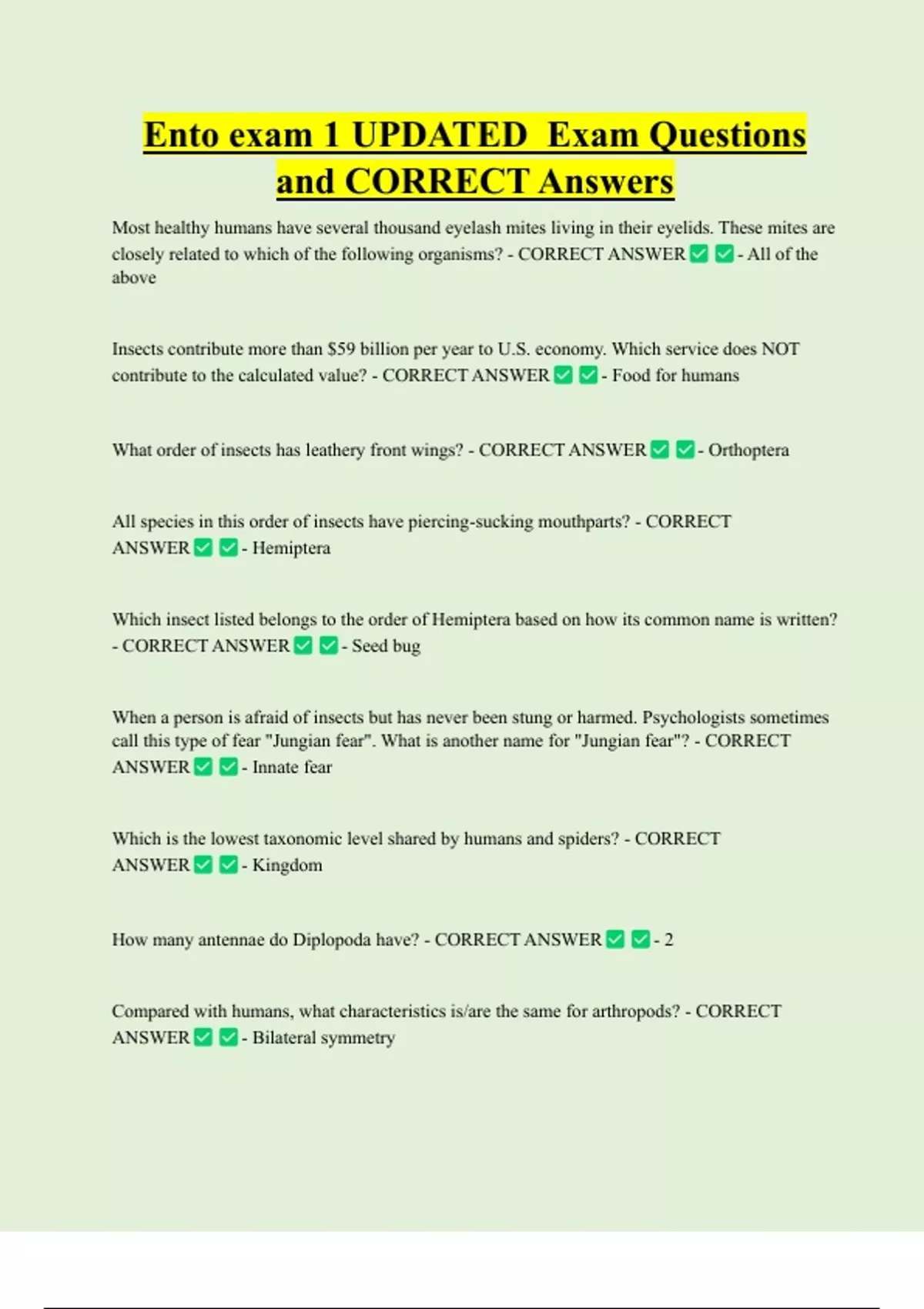 Ento exam 1 UPDATED Exam Questions and CORRECT Answers Most healthy humans have several thousand eyelash mites living in their eyelids. These mites are closely related to which of the following organisms? - CORRECT ANSWER - All of the above Insects contribute more than $59 billion per year to U.S. economy. Which service does NOT contribute to the calculated value? - CORRECT ANSWER - Food for humans