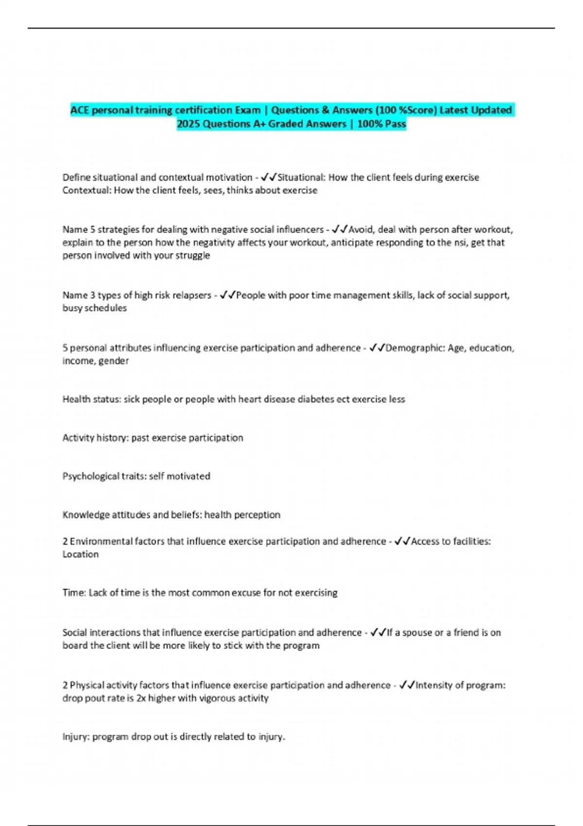 ACE personal training certification Exam | Questions & Answers (100 %Score) Latest Updated 2025 Questions A+ Graded Answers | 100% Pass
