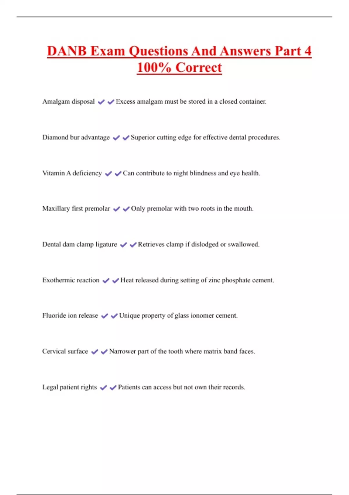 DANB Exam Questions And Answers Part 4 100% Correct Amalgam disposal Excess amalgam must be stored in a closed container. Diamond bur advantage Superior cutting edge for effective dental procedures. Vitamin A deficiency Can contribute to night blindness and eye health. Maxillary first premolar Only premolar with two roots in the mouth. Dental dam clamp ligature Retrieves clamp if dislodged or swallowed. Exothermic reaction Heat released during setting of zinc phosphate cement. Fluoride ion release Unique property of glass ionomer cement.
