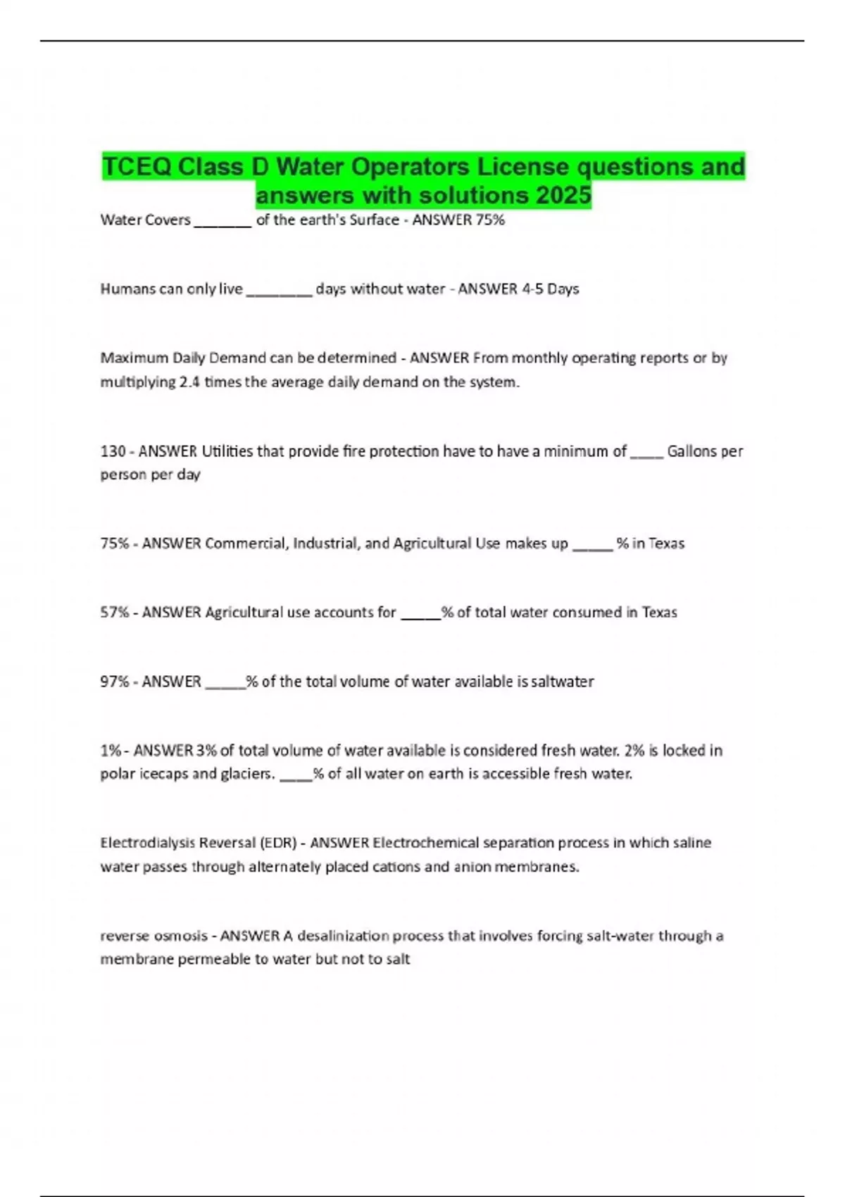 TCEQ Class D Water Operators License questions and answers with solutions 2025