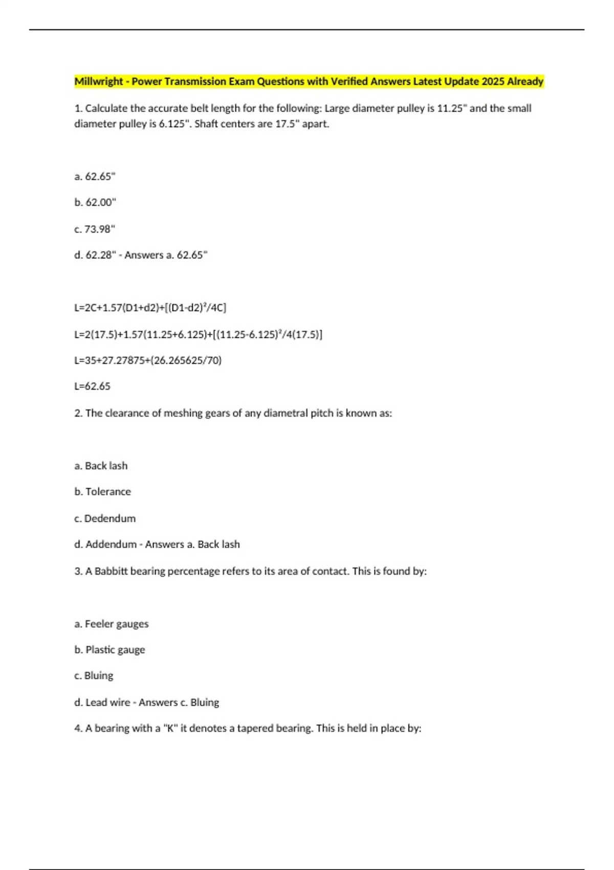 Millwright - Power Transmission Exam Questions with Verified Answers Latest Update 2025 Already 1. Calculate the accurate belt length for the following: Large diameter pulley is 11.25" and the small diameter pulley is 6.125". Shaft centers are 17.5" apart. a. 62.65" b. 62.00" c. 73.98" d. 62.28" - Answers a. 62.65" L=2C+1.57(D1+d2)+[(D1-d2)²/4C] L=2(17.5)+1.57(11.25+6.125)+[(11.25-6.125)²/4(17.5)] L=35+27.27875+(26.265625/70) L=62.65 2. The clearance of meshing gears of any diametral pitch is known as: a. Back lash b. Tolerance c. Dedendum d. Addendum - Answers a. Back lash 3. A Babbitt bearing percentage refers to its area of contact. This is found by: a. Feeler gauges b. Plastic gauge c. Bluing d. Lead wire - Answers c. Bluing 4. A bearing with a "K" it denotes a tapered bearing. This is held in place by: a. Shaft collar b. A tapered adapter sleeve c. Lock nut d. Thread locker - Answers b. A tapered adapter sleeve 5. An 8" pulley turns at 120 RPM and drives a second pulley at 150 RPM. What is the driven pulley diameter? a. 4.6" b. 6.4" c. 8.3" d. 3.8" - Answers b. 6.4" 120RPM/150RPM = 0.8 ratio 0.8 x 8" = 6.4" 6. The letters A, B, C on a sprocket refers to: a. Tooth size b. Pitch c. Hub Class d. Type of chain - Answers c. Hub Class 7. Crowning on a pulley is used for: a. Decreased wear b. Tension c. Self alignment d. To allow for different classes of belts - Answers c. Self alignment 8. The standard taper on an imperial key is: a. 1:100 b. 1:96 c. 1:4 d. 1:25 - Answers b. 1:96 9. A type of bearing mounted face to face and back-to-back is: a. Angular contact b. Conrad c. Ball d. Pillow Block - Answers a. Angular contact 10. A bearing with a code of SKF 6212 has a bore of: a. 12mm b. 1⁄2" c. 60mm d. 62mm - Answers c. 60mm 11. A belt is wrapped around a 6.25" pulley and has 220 degrees of contact. How much of the belt is contacting the pulley? (Use 3.14159 for pi) a. 12" b. 11.999" c. 12.999"