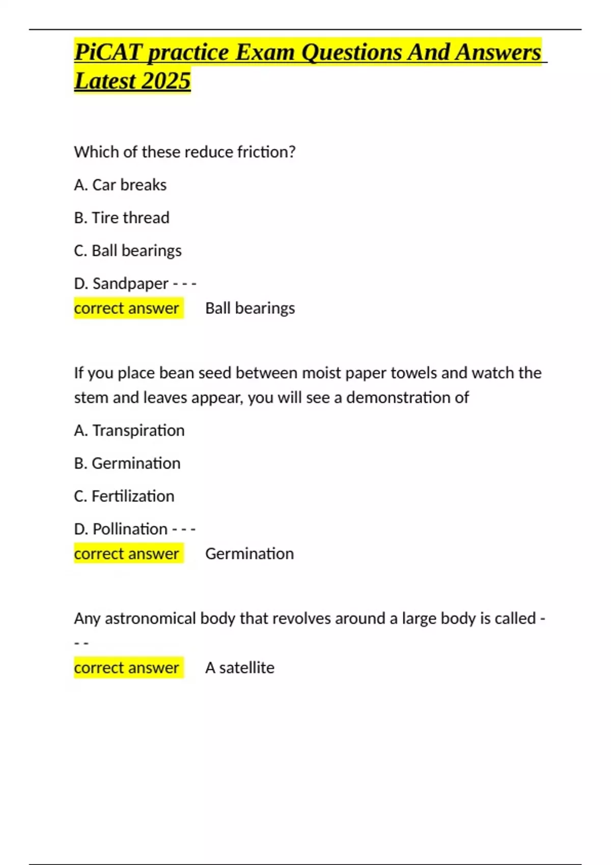 , PiCAT practice Exam Questions And Answers