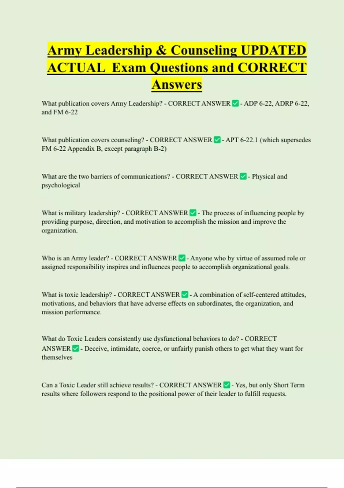 Army Leadership & Counseling UPDATED ACTUAL Exam Questions and CORRECT Answers What publication covers Army Leadership? - CORRECT ANSWER - ADP 6-22, ADRP 6-22, and FM 6-22 What publication covers counseling? - CORRECT ANSWER - APT 6-22.1 (which supersedes FM 6-22 Appendix B, except paragraph B-2)