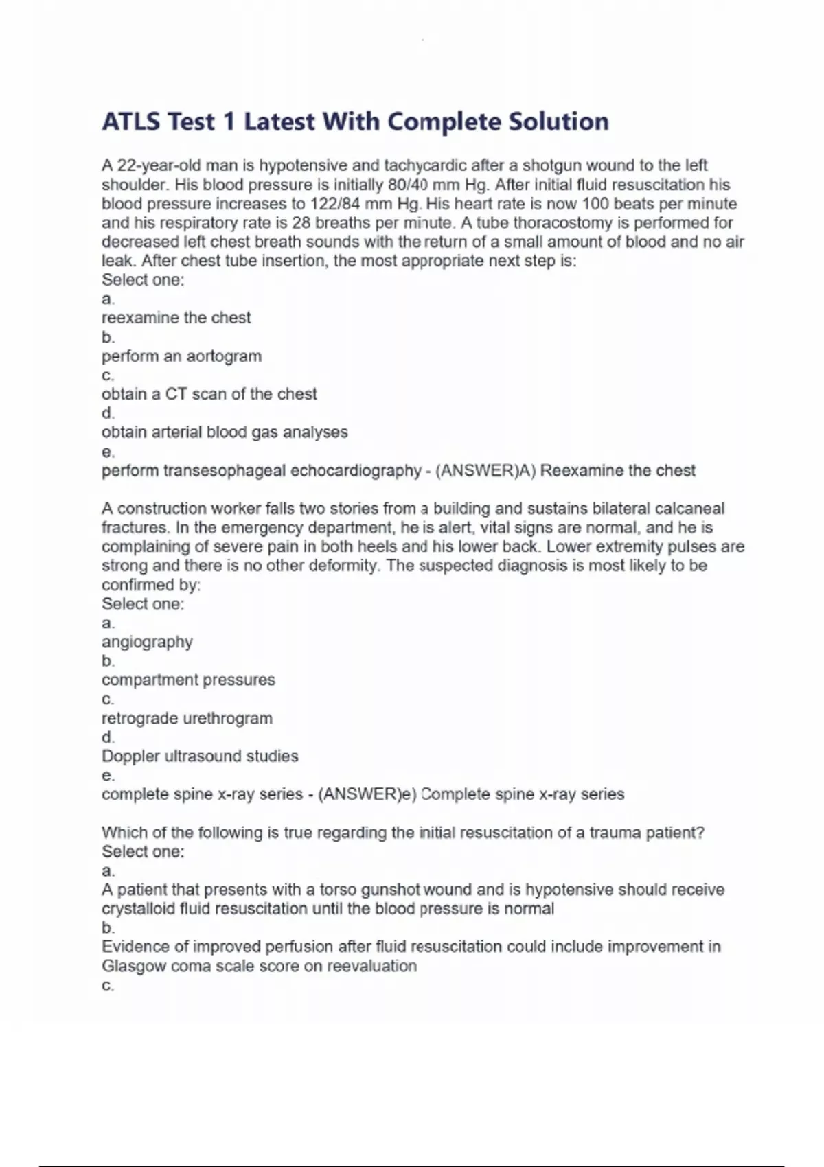 ATLS Test 1 Latest With Complete Solution A 22-year-old man is hypotensive and tachycardic after a shotgun wound to the left shoulder. His blood pressure is initially 80/40 mm Hg. After initial fluid resuscitation his blood pressure increases to 122/84 mm Hg. His heart rate is now 100 beats per minute and his respiratory rate is 28 breaths per minute. A tube thoracostomy is performed for decreased left chest breath sounds with the return of a small amount of blood and no air leak. After chest tube insertion, the most appropriate next step is: Select one: a. reexamine the chest b. perform an aortogram c. obtain a CT scan of the chest d. obtain arterial blood gas analyses e. perform transesophageal echocardiography - (ANSWER)A) Reexamine the chest A construction worker falls two stories from a building and sustains bilateral calcaneal fractures. In the emergency department, he is alert, vital signs are normal, and he is complaining of severe pain in both heels and his lower back. Lower extremity pulses are strong and there is no other deformity. The suspected diagnosis is most likely to be confirmed by: Select one: a. angiography b. compartment pressures c. retrograde urethrogram d. Doppler ultrasound studies e. complete spine x-ray series - (ANSWER)e) Complete spine x-ray series Which of the following is true regarding the initial resuscitation of a trauma patient? Select one: a. A patient that presents with a torso gunshot wound and is hypotensive should receive crystalloid fluid resuscitation until the blood pressure is normal b. Evidence of improved perfusion after fluid resuscitation could include improvement in Glasgow coma scale score on reevaluation c.