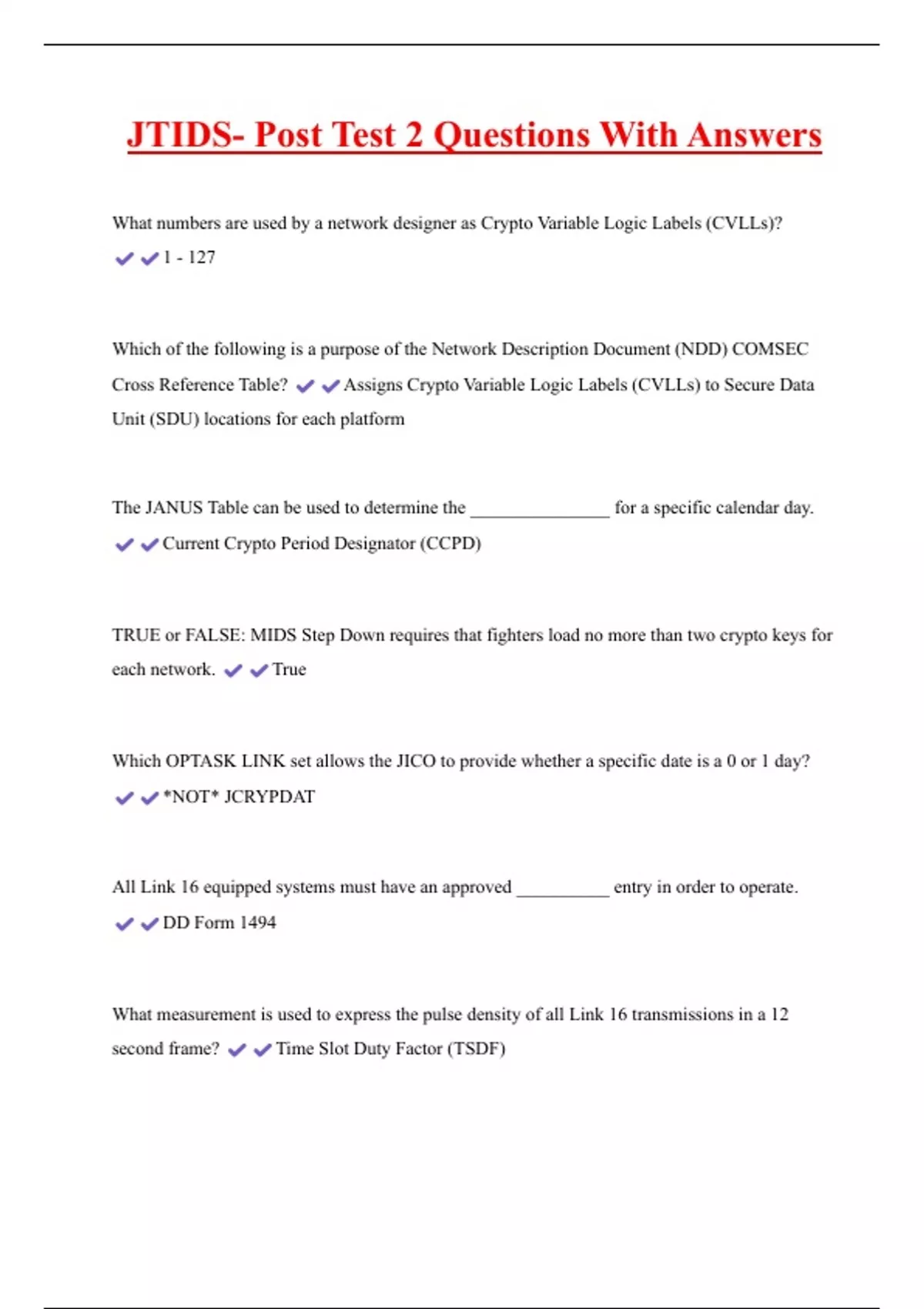 JTIDS- Post Test 2 Questions With Answers What numbers are used by a network designer as Crypto Variable Logic Labels (CVLLs)? 1 - 127 Which of the following is a purpose of the Network Description Document (NDD) COMSEC Cross Reference Table? Assigns Crypto Variable Logic Labels (CVLLs) to Secure Data Unit (SDU) locations for each platform The JANUS Table can be used to determine the _______________ for a specific calendar day. Current Crypto Period Designator (CCPD) TRUE or FALSE: MIDS Step Down requires that fighters load no more than two crypto keys for each network. True