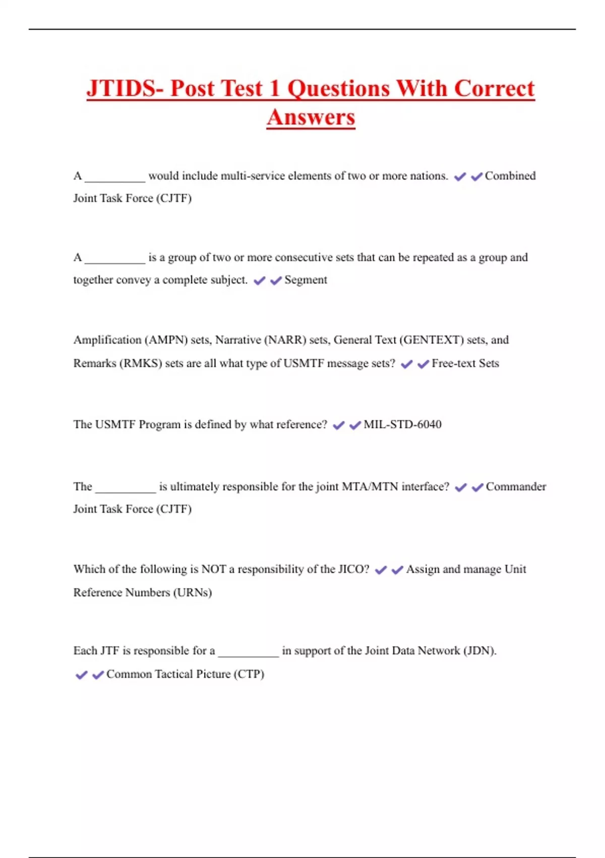 JTIDS- Post Test 1 Questions With Correct Answers A __________ would include multi-service elements of two or more nations. Combined Joint Task Force (CJTF) A __________ is a group of two or more consecutive sets that can be repeated as a group and together convey a complete subject. Segment Amplification (AMPN) sets, Narrative (NARR) sets, General Text (GENTEXT) sets, and Remarks (RMKS) sets are all what type of USMTF message sets? Free-text Sets The USMTF Program is defined by what reference? MIL-STD-6040 The __________ is ultimately responsible for the joint MTA/MTN interface? Commander Joint Task Force (CJTF)