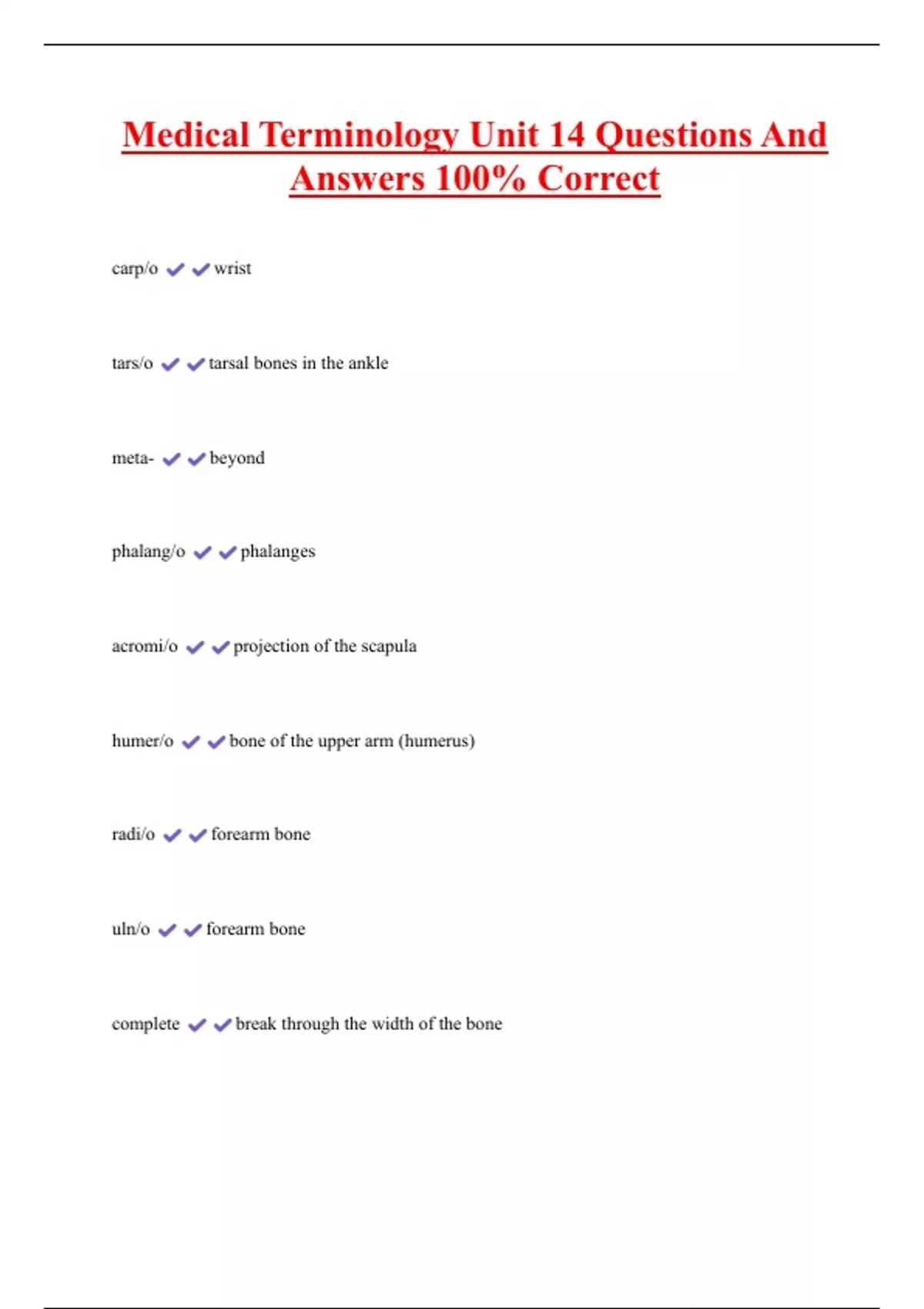 Medical Terminology Unit 14 Questions And Answers 100% Correct carp/o wrist tars/o tarsal bones in the ankle meta- beyond phalang/o phalanges acromi/o projection of the scapula