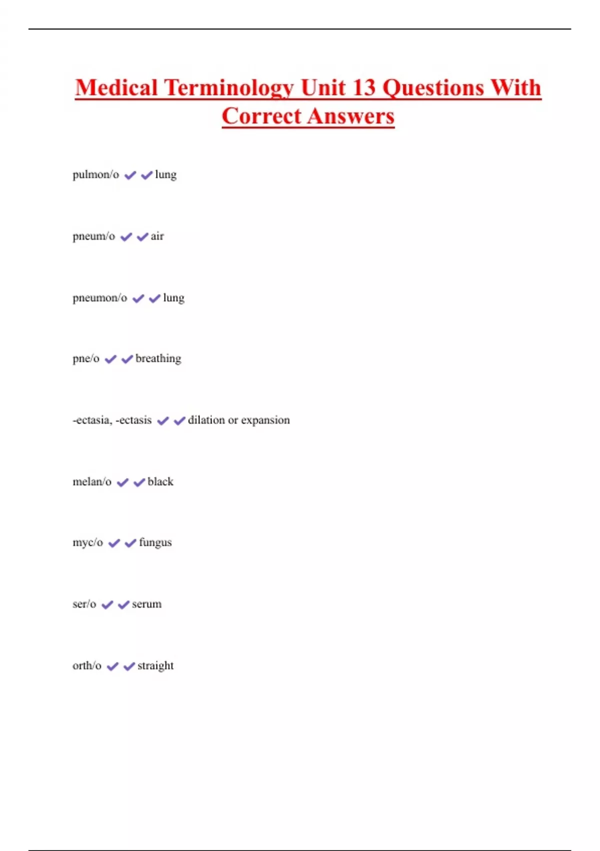 Medical Terminology Unit 13 Questions With Correct Answers pulmon/o lung pneum/o air pneumon/o lung pne/o breathing -ectasia, -ectasis dilation or expansion