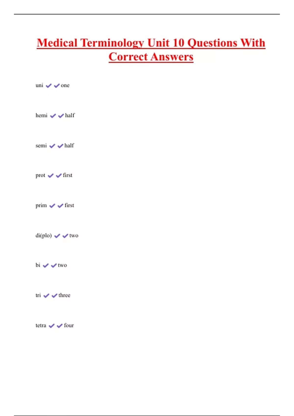 Medical Terminology Unit 10 Questions With Correct Answers uni one hemi half semi half prot first prim first di(plo) two