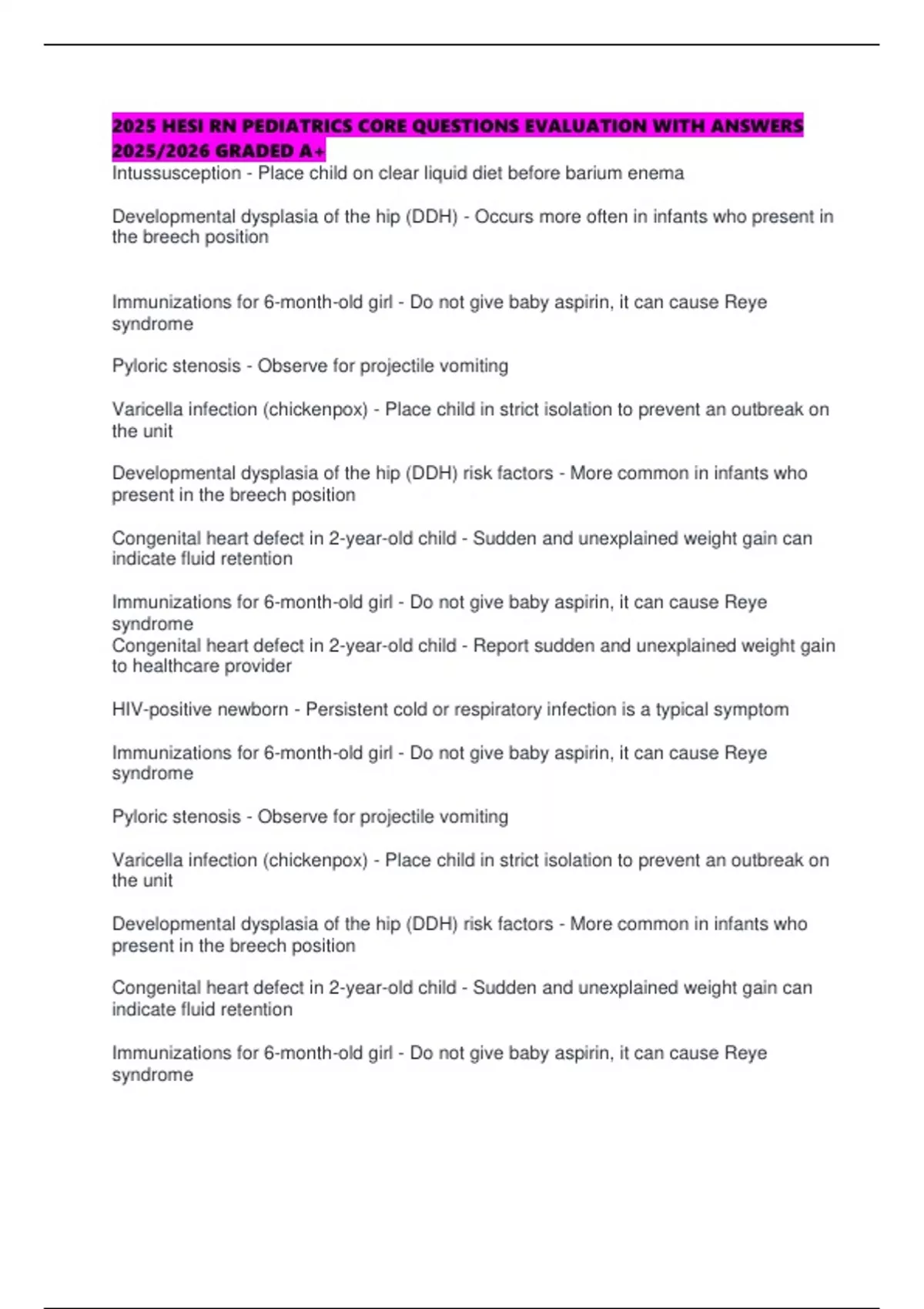 2025 HESI RN PEDIATRICS CORE QUESTIONS EVALUATION WITH ANSWERS 2025/2026 GRADED A+ Intussusception - Place child on clear liquid diet before barium enema Developmental dysplasia of the hip (DDH) - Occurs more often in infants who present in the breech position Immunizations for 6-month-old girl - Do not give baby aspirin, it can cause Reye syndrome Pyloric stenosis - Observe for projectile vomiting Varicella infection (chickenpox) - Place child in strict isolation to prevent an outbreak on the unit Developmental dysplasia of the hip (DDH) risk factors - More common in infants who present in the breech position