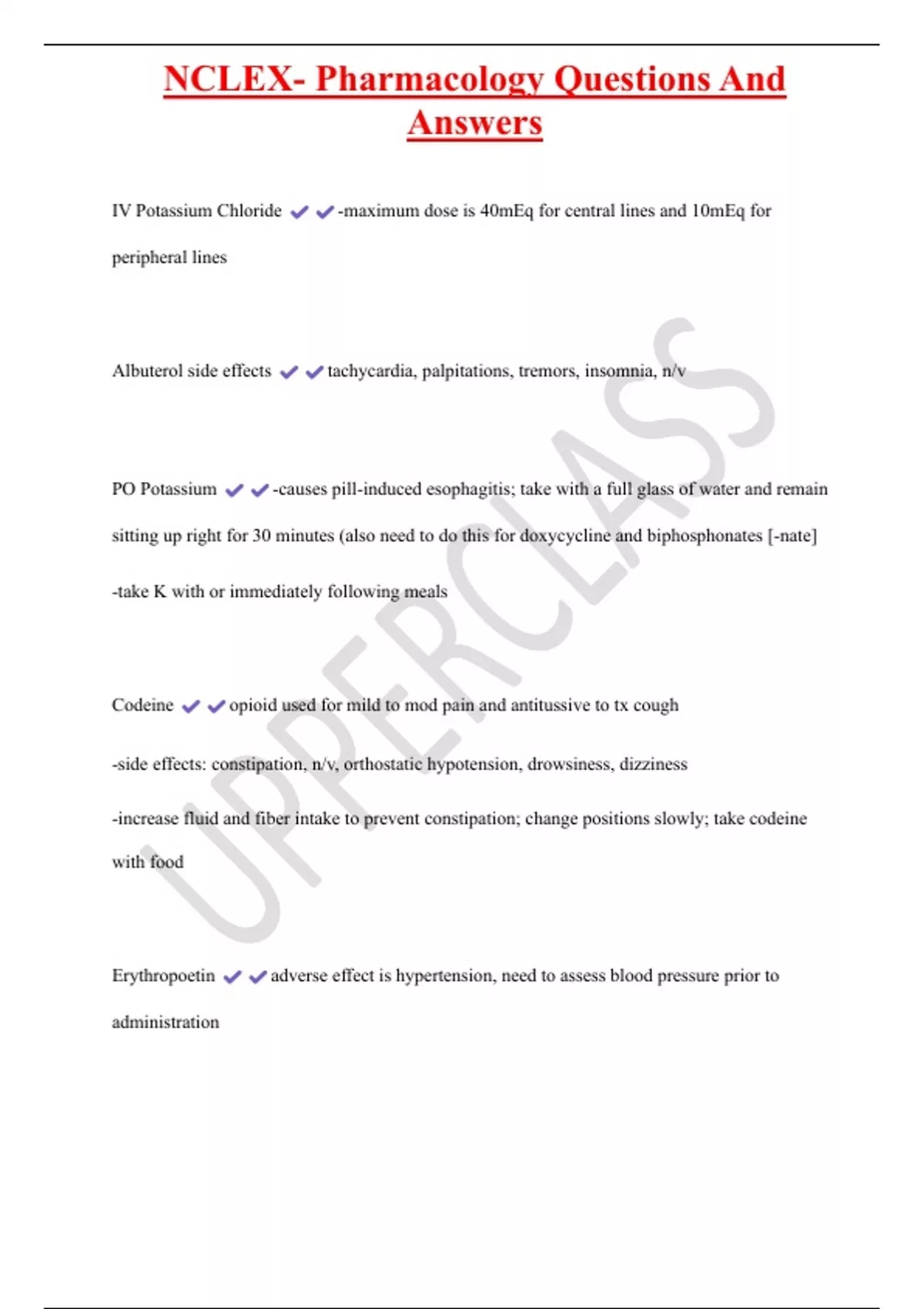 NCLEX- Pharmacology Questions And Answers IV Potassium Chloride -maximum dose is 40mEq for central lines and 10mEq for peripheral lines Albuterol side effects tachycardia, palpitations, tremors, insomnia, n/v PO Potassium -causes pill-induced esophagitis; take with a full glass of water and remain sitting up right for 30 minutes (also need to do this for doxycycline and biphosphonates [-nate] -take K with or immediately following meals