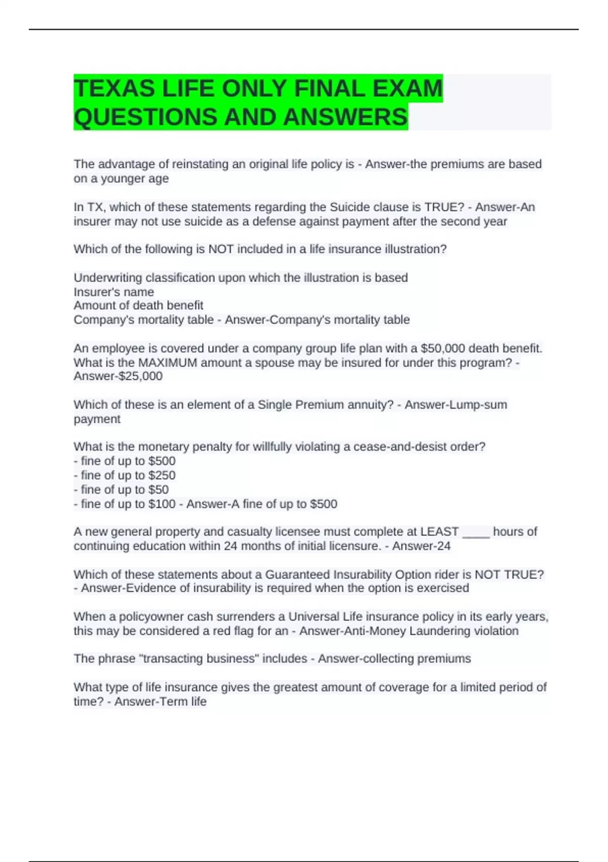 TEXAS LIFE ONLY FINAL EXAM QUESTIONS AND ANSWERS
