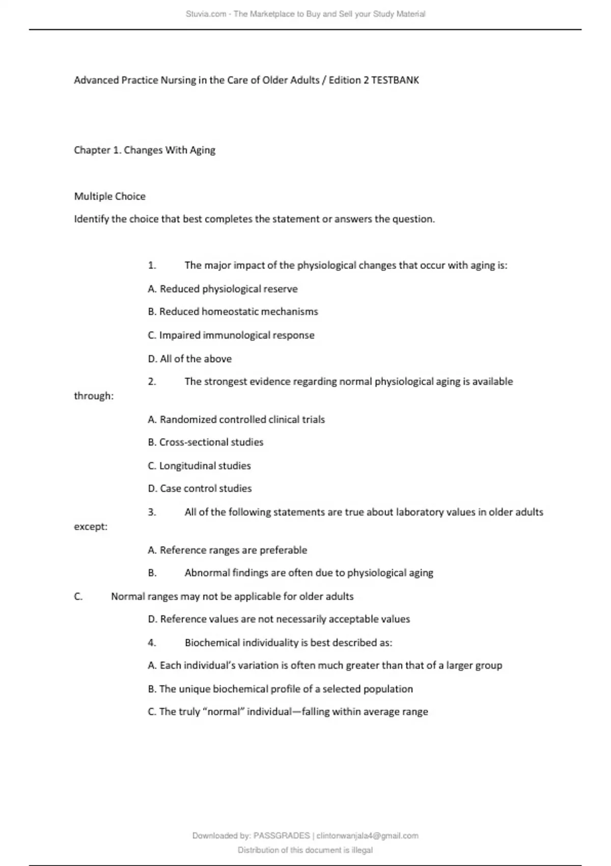 The Test Bank for Advanced Practice Nursing in the Care of Older Adults, 2nd Edition is a comprehensive resource designed to support nursing students and educators in mastering geriatric nursing concepts. This extensive test bank includes a variety of multiple-choice questions, true/false statements, and short-answer questions that align with the key topics presented in the textbook. Covering all 19 chapters, it addresses areas such as aging processes, health promotion, comprehensive geriatric assessment, and management of common disorders in older adults. This resource is ideal for exam preparation, helping students assess their understanding and apply knowledge to clinical practice.
