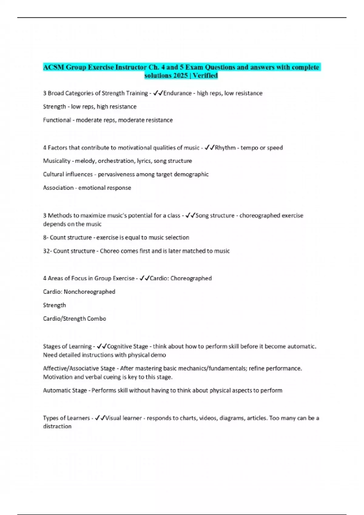 ACSM Group Exercise Instructor Ch. 4 and 5 Exam Questions and answers with complete solutions 2025 | Verified