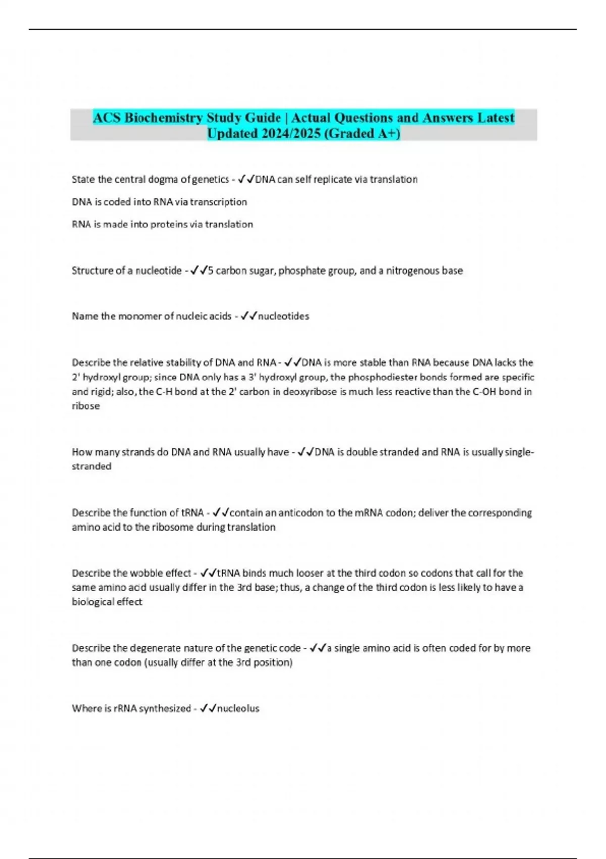 ACS Biochemistry Study Guide | Actual Questions and Answers Latest Updated 2024/2025 (Graded A+)