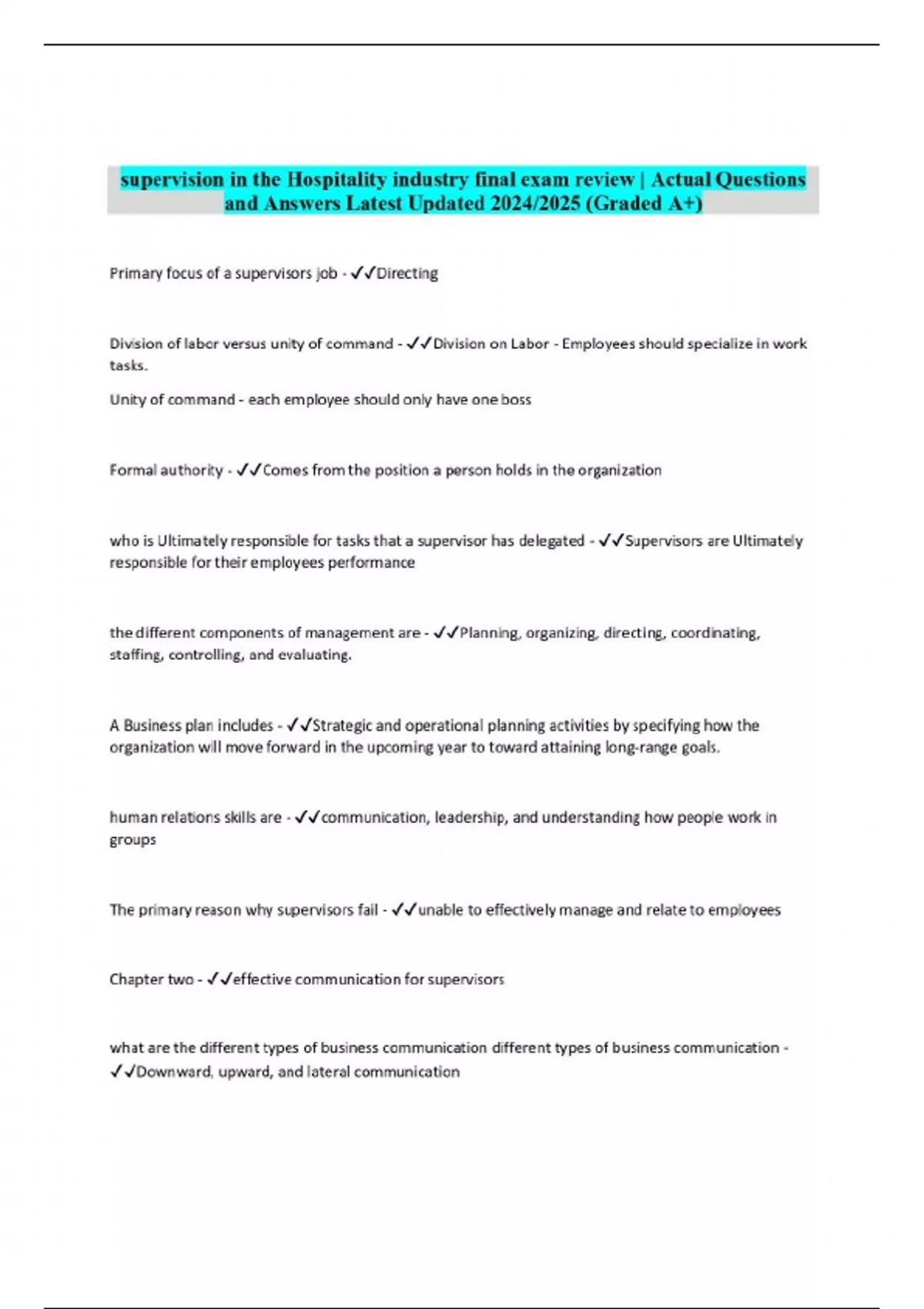supervision in the Hospitality industry final exam review | Actual Questions and Answers Latest Updated 2024/2025 (Graded A+)