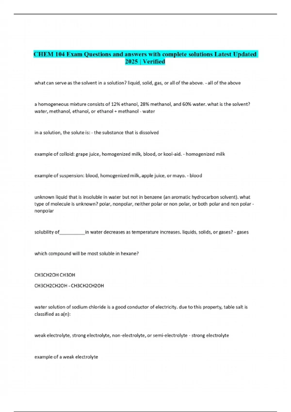 CHEM 104 Exam Questions and answers with complete solutions Latest Updated 2025 | Verified