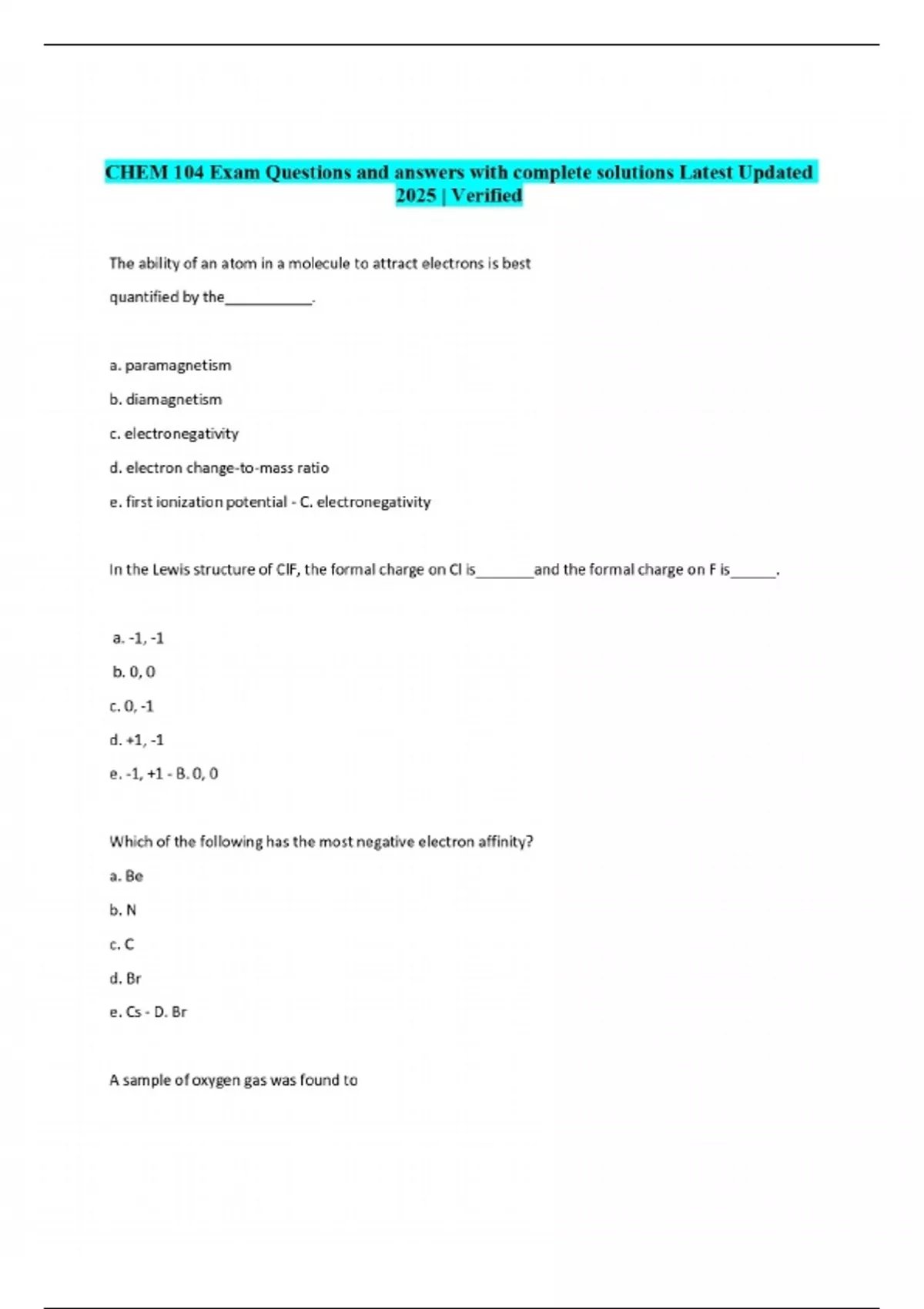 CHEM 104 Exam Questions and answers with complete solutions Latest Updated 2025 | Verified