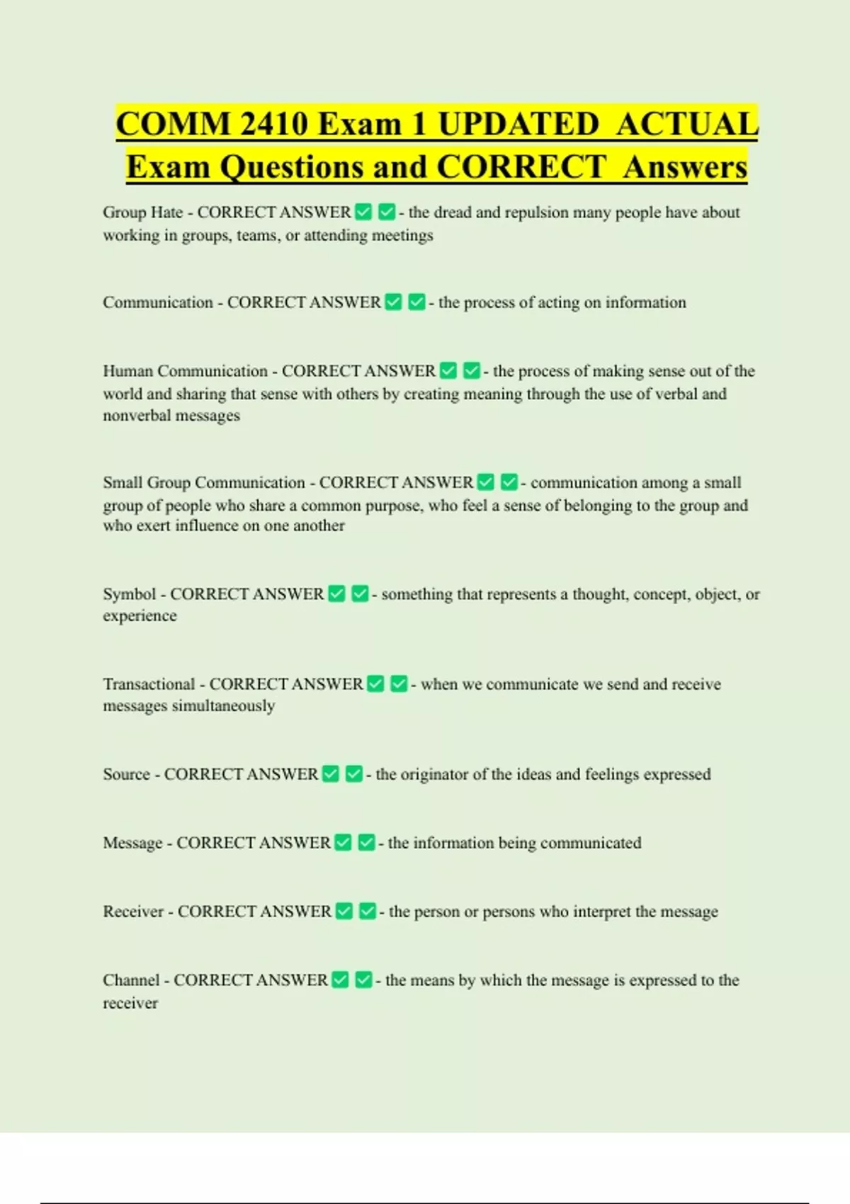COMM 2410 Exam 1 UPDATED ACTUAL Exam Questions and CORRECT Answers Group Hate - CORRECT ANSWER - the dread and repulsion many people have about working in groups, teams, or attending meetings Communication - CORRECT ANSWER - the process of acting on information Human Communication - CORRECT ANSWER - the process of making sense out of the world and sharing that sense with others by creating meaning through the use of verbal and nonverbal messages
