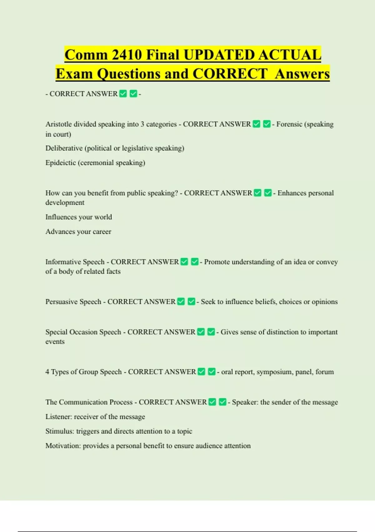 Comm 2410 Final UPDATED ACTUAL Exam Questions and CORRECT Answers - CORRECT ANSWER - Aristotle divided speaking into 3 categories - CORRECT ANSWER - Forensic (speaking in court) Deliberative (political or legislative speaking) Epideictic (ceremonial speaking)