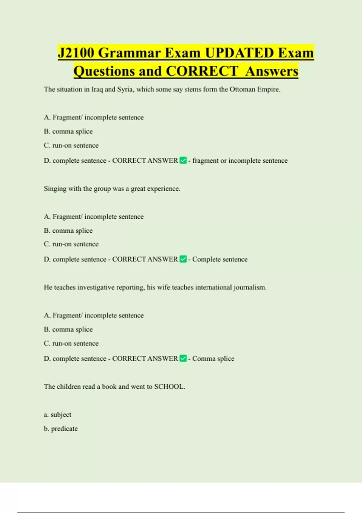 J2100 Grammar Exam UPDATED Exam Questions and CORRECT Answers The situation in Iraq and Syria, which some say stems form the Ottoman Empire. A. Fragment/ incomplete sentence B. comma splice C. run-on sentence D. complete sentence - CORRECT ANSWER - fragment or incomplete sentence