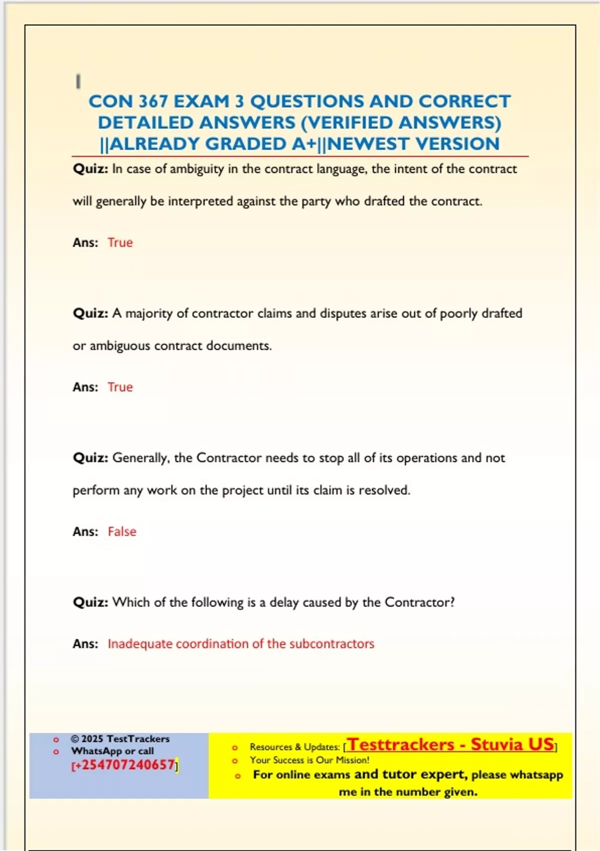 Quiz: In case of ambiguity in the contract language, the intent of the contract will generally be interpreted against the party who drafted the contract. Ans: True Quiz: A majority of contractor claims and disputes arise out of poorly drafted or ambiguous contract documents. Ans: True Quiz: Generally, the Contractor needs to stop all of its operations and not perform any work on the project until its claim is resolved. Ans: False Quiz: Which of the following is a delay caused by the Contractor? Ans: Inadequate coordination of the subcontractors o © 2025 TestTrackers o or call [] o Resources & Updates: [Testtrackers - Stuvia US] o Your Success is Our Mission! o For online exams and tutor expert, please me in the number given. Quiz: Which of the following terms is not a type of acceleration as used for the construction projects? Ans: Instant acceleration Quiz: According to the supplemental reading, even the best trained and experienced construction lawyer needs a significant amount of input from his/her client to prepare a construction case. Ans: True Quiz: Weather conditions that delay a project are always excusable and compensable. Ans: Fals