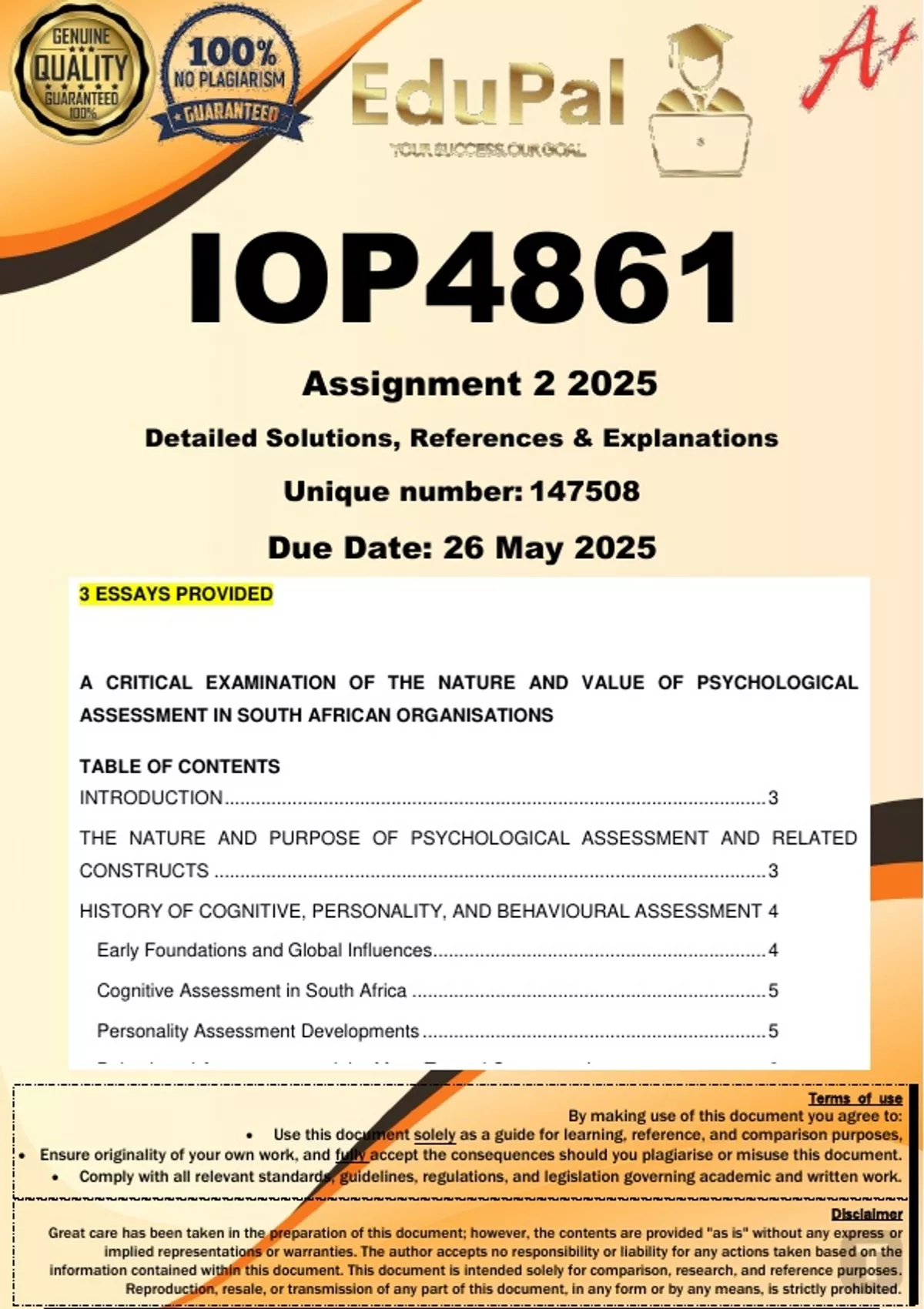 IOP4861 Assignment 2 (COMPLETE ANSWERS) 2025 (147508) - DUE 26 May 2025; 100% TRUSTED Complete, trusted solutions and explanations. For assistance, Whats-App 0.6.7-1.7.1-1.7.3.9. Ensure your success with us.. Psychological assessments have been misused in the South African work context. Yet, organisations extensively rely on psychological assessment results to make important selection and development decisions. Write an essay to present your critical view on the nature and value of psychological assessment. • The nature and purpose of psychological assessment and related constructs (1 short paragraph) Here, you should clarify what psychological assessment is, what we use it for, and why it could be a valuable tool in organizational decision-making. You should also explain all related concepts. Downloaded by Thomas Mboya () lOMoARcPSD| • History of cognitive, personality and behavioural assessment Present a historical perspective on the development and application of psychological assessment in terms of cognitive, personality and behavioural assessment. In your discussion you should also highlight how research gave rise to the development of different psychological measures that are used in the SA work context today – identify at least three to four cognitive and personality measures and briefly explain the evolvement of competency-based assessment and the use of interviews and simulations in terms of behavioural assessment. • Psychological assessment in the multicultural South African context Explain why it is so important to think about assessment in a multicultural context and how test moderators bias test results which lead to unfair assessments. It should be evident that you understand what test moderators are in the SA context and the difference between fairness and bias. • What has been done to enhance the fairness of psychological assessment practices in the South African context In this section you need to critically discuss how the Employment Equity Act regulates and guides fair assessment; and explain how the Psychology profession regulates itself to ensure fair assessment practice. • Conclusion (1 paragraph) Provide a succinct conclusion of the objective of the essay and your main findings. SELF-EVALUATION (10%) 1. Give yourself a mark for this assignment and motivate why you give yourself this mark. 2. Indicate where in the assignment you performed at your best and where you performed poorly. 3. Resources: Which of the prescribed and/or recommended sources did you find most useful and which additional sources did you use (if any)? 4. How much time did you spend on the assignment? 5. How relevant are the sources provided for this paper to the realities, for example, of industrial psychological assessment in the South African work context? 6. Did the assignment tasks add value to the application of your knowledge and skills in the workplace? Please explain the application value. 7. What aspects of the module, study material, and learning experience would you like to improve? How? 8. How would you describe the quality of the learning material (tutorial letter, articles, prescribed book)? 9. Do the assignment tasks reflect the learning outcomes? 10. Did you consult with and were the lecturer and administrative support of an expected standard?