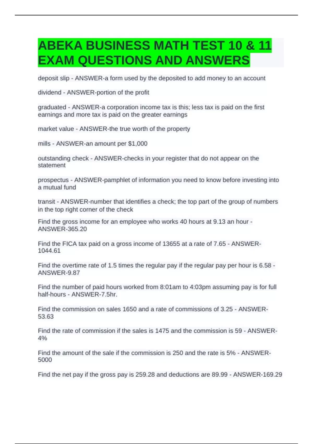 ABEKA BUSINESS MATH TEST 10 & 11