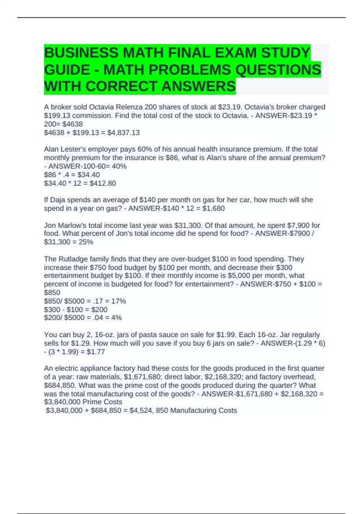 BUSINESS MATH FINAL EXAM STUDY GUIDE - MATH PROBLEMS QUESTIONS WITH CORRECT ANSWERS
