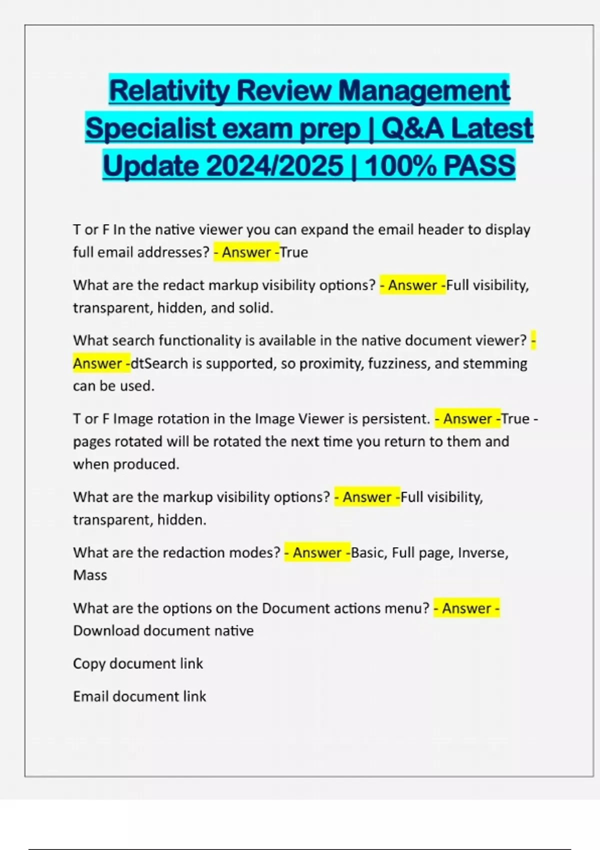 Relativity Review Management Specialist exam prep | Q&A Latest Update 2024/2025 | 100% PASS T or F In the native viewer you can expand the email header to display full email addresses? - Answer -True What are the redact markup visibility options? - Answer -Full visibility, transparent, hidden, and solid. What search functionality is available in the native document viewer? - Answer -dtSearch is supported, so proximity, fuzziness, and stemming can be used. T or F Image rotation in the Image Viewer is persistent. - Answer -True - pages rotated will be rotated the next time you return to them and when produced. What are the markup visibility op