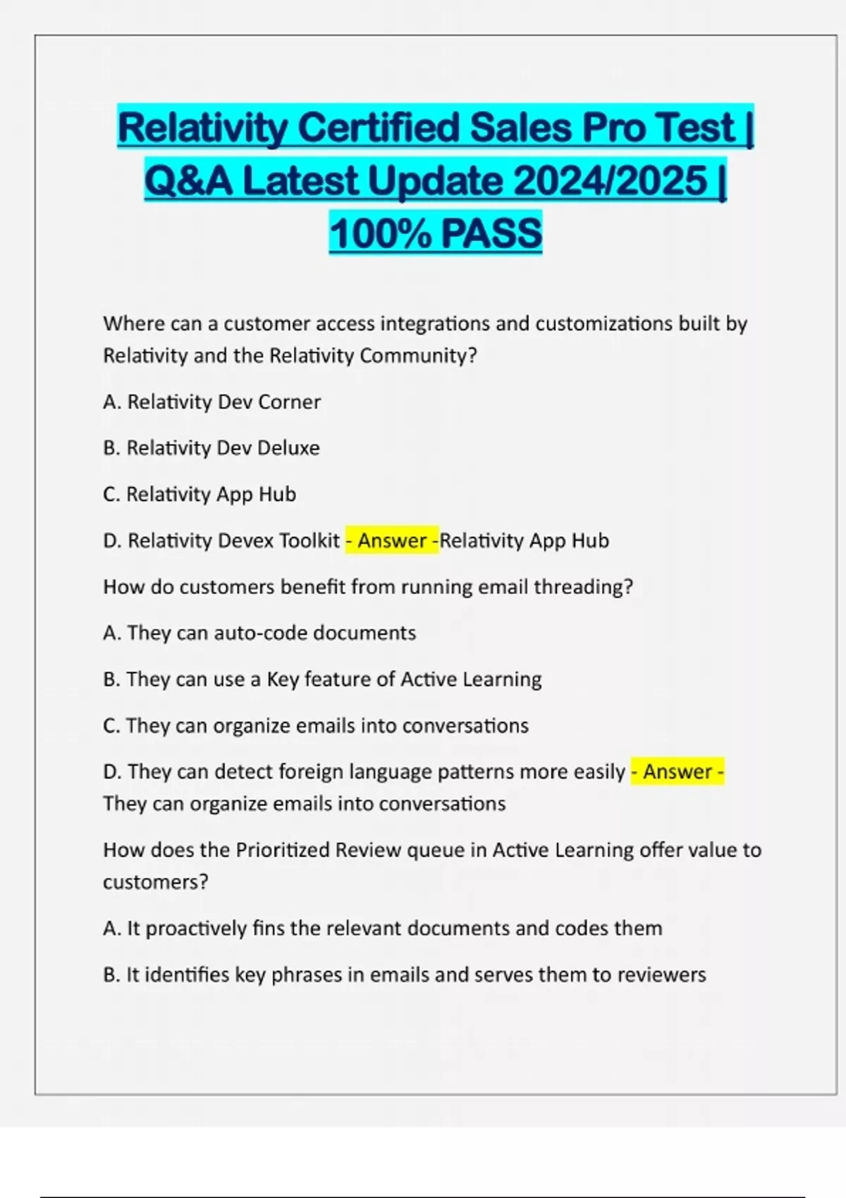 Relativity Certified Sales Pro Test | Q&A Latest Update 2024/2025 | 100% PASS Where can a customer access integrations and customizations built by Relativity and the Relativity Community? A. Relativity Dev Corner B. Relativity Dev Deluxe C. Relativity App Hub D. Relativity Devex Toolkit - Answer -Relativity App Hub How do customers benefit from running email threading? A. They can auto-code documents B. They can use a Key feature of Active Learning C. They can organize emails into conversations D. They can detect foreign language patterns more easily - Answer - They can organize emails into conversations How does the Prioritized Review queue in Active Learning offer value to customers? A. It proactively fins the relevant documents and codes them B. It identifies key phrases in emails and serves them to reviewersC. It identifies Key documents most like