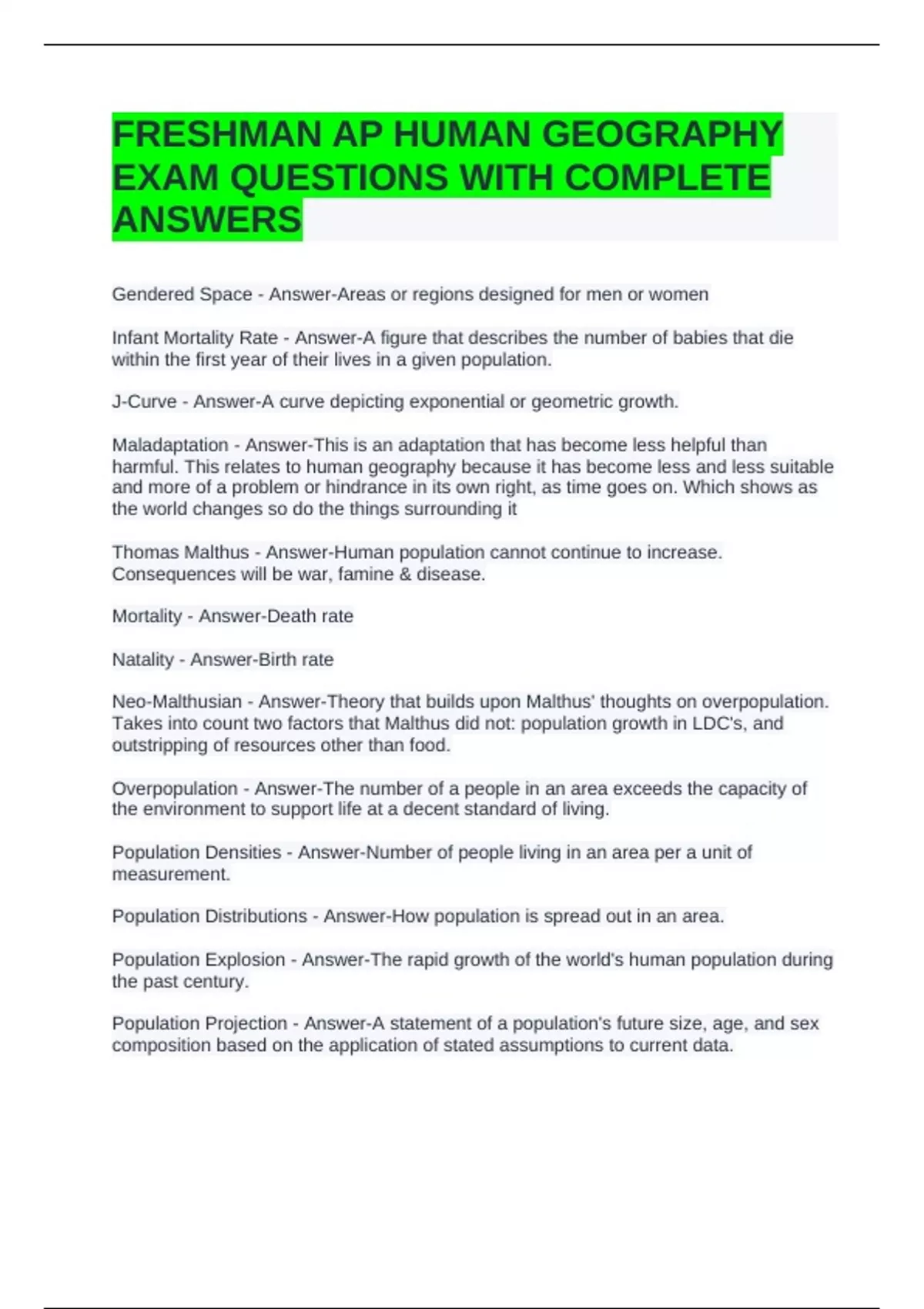 Neo-Malthusian - Answer-Theory that builds upon Malthus' thoughts on overpopulation.