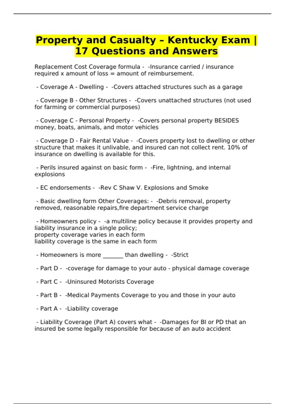 Property and Casualty – Kentucky Exam |17 Questions and Answers