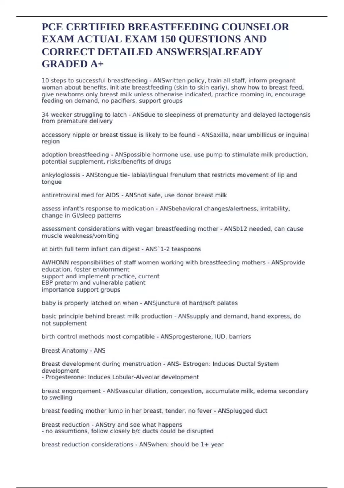 PCE CERTIFIED BREASTFEEDING COUNSELOR EXAM ACTUAL EXAM 150 QUESTIONS AND