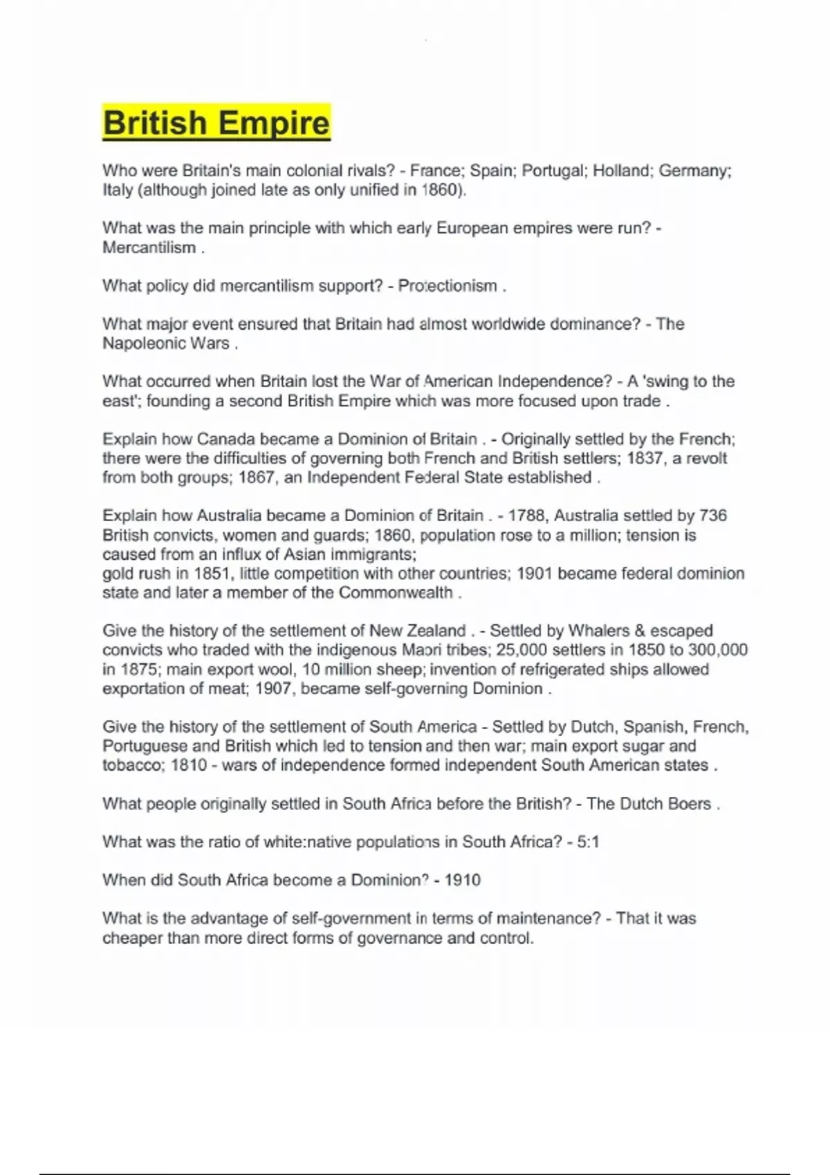 Who were Britain's main colonial rivals? - France; Spain; Portugal; Holland; Germany; Italy (although joined late as only unified in 1860). What was the main principle with which early European empires were run? - Mercantilism . What policy did mercantilism support? - Protectionism . What major event ensured that Britain had almost worldwide dominance? - The Napoleonic Wars . What occurred when Britain lost the War of American Independence? - A 'swing to the east'; founding a second British Empire which was more focused upon trade . Explain how Canada became a Dominion of Britain . - Originally settled by the French; there were the difficulties of governing both French and British settlers; 1837, a revolt from both groups; 1867, an Independent Federal State established . Explain how Australia became a Dominion of Britain . - 1788, Australia settled by 736 British convicts, women and guards; 1860, population rose to a million; tension is caused from an influx of Asian immigrants; gold rush in 1851, little competition with other countries; 1901 became federal dominion state and later a member of the Commonwealth . Give the history of the settlement of New Zealand . - Settled by Whalers & escaped convicts who traded with the indigenous Maori tribes; 25,000 settlers in 1850 to 300,000 in 1875; main export wool, 10 million sheep; invention of refrigerated ships allowed exportation of meat; 1907, became self-governing Dominion .