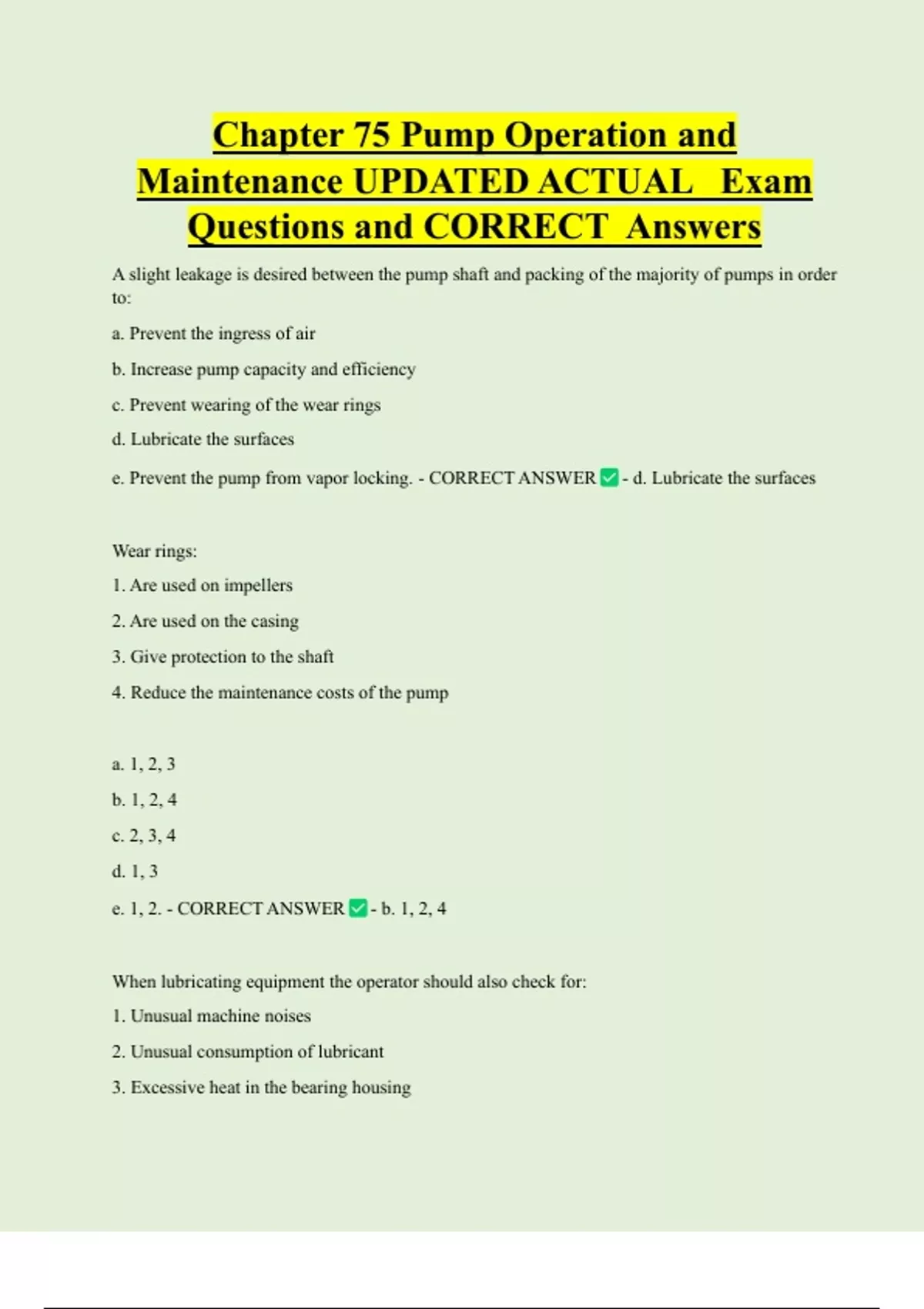 Chapter 75 Pump Operation and Maintenance UPDATED ACTUAL Exam Questions and CORRECT Answers