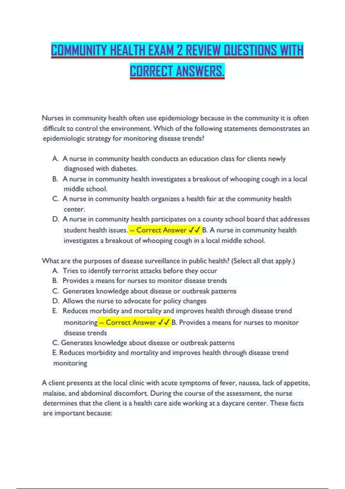 COMMUNITY HEALTH EXAM 2 REVIEW QUESTIONS WITH CORRECT ANSWERS