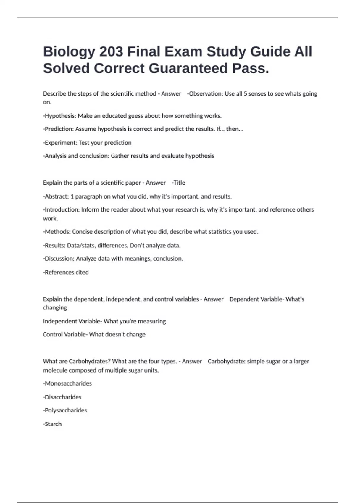Describe the steps of the scientific method - Answer -Observation: Use all 5 senses to see whats going on. -Hypothesis: Make an educated guess about how something works. -Prediction: Assume hypothesis is correct and predict the results. If... then... -Experiment: Test your prediction -Analysis and conclusion: Gather results and evaluate hypothesis Explain the parts of a scientific paper - Answer -Title -Abstract: 1 paragraph on what you did, why it's important, and results. -Introduction: Inform the reader about what your research is, why it's important, and reference others work. -Methods: Concise description of what you did, describe what statistics you used. -Results: Data/stats, differences. Don't analyze data. -Discussion: Analyze data with meanings, conclusion. -References cited Explain the dependent, independent, and control variables - Answer Dependent Variable- What's changing Independent Variable- What you're measuring Control Variable- What doesn't change What are Carbohydrates? What are the four types. - Answer Carbohydrate: simple sugar or a larger molecule composed of multiple sugar units. -Monosaccharides -Disaccharides -Polysaccharides -Starch