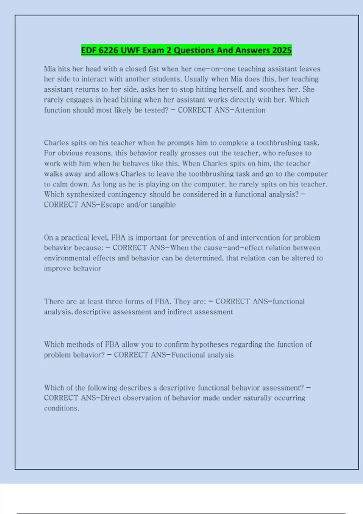EDF 6226 UWF Exam 2 Questions And Answers 2025 Mia hits her head with a closed fist when her one-on-one teaching assistant leaves her side to interact with another students. Usually when Mia does this, her teaching assistant returns to her side, asks her to stop hitting herself, and soothes her. She rarely engages in head hitting when her assistant works directly with her. Which function should most likely be tested? - CORRECT ANS-Attention Charles spits on his teacher when he prompts him to complete a toothbrushing task. For obvious reasons, this behavior really grosses out the teacher, who refuses to work with him when he behaves like this. When Charles spits on him, the teacher walks away and allows Charles to leave the toothbrushing task and go to the computer to calm down. As long as he is playing on the computer, he rarely spits on his teacher. Which synthesized contingency should be considered in a functional analysis? - CORRECT ANS-Escape and/or tangible On a practical level, FBA is important for prevention of and intervention for problem behavior because: - CORRECT ANS-When the cause-and-effect relation between environmental effects and behavior can be determined, that relation can be altered to improve behavior There are at least three forms of FBA. They are: - CORRECT ANS