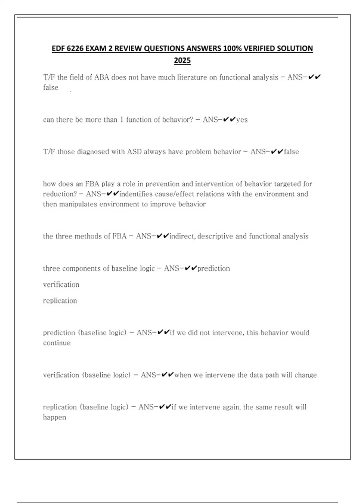 EDF 6226 EXAM 2 REVIEW QUESTIONS ANSWERS 100% VERIFIED SOLUTION 2025 T/F the field of ABA does not have much literature on functional analysis - ANS-false can there be more than 1 function of behavior? - ANS-yes T/F those diagnosed with ASD always have problem behavior - ANS-false how does an FBA play a role in prevention and intervention of behavior targeted for reduction? - ANS-indentifies cause/effect relations with the environment and then manipulates environment to improve behavior the three methods of FBA - ANS-indirect, descriptive and functional analysis three components of baseline logic - ANS-prediction verification replication prediction (baseline logic) - ANS-if