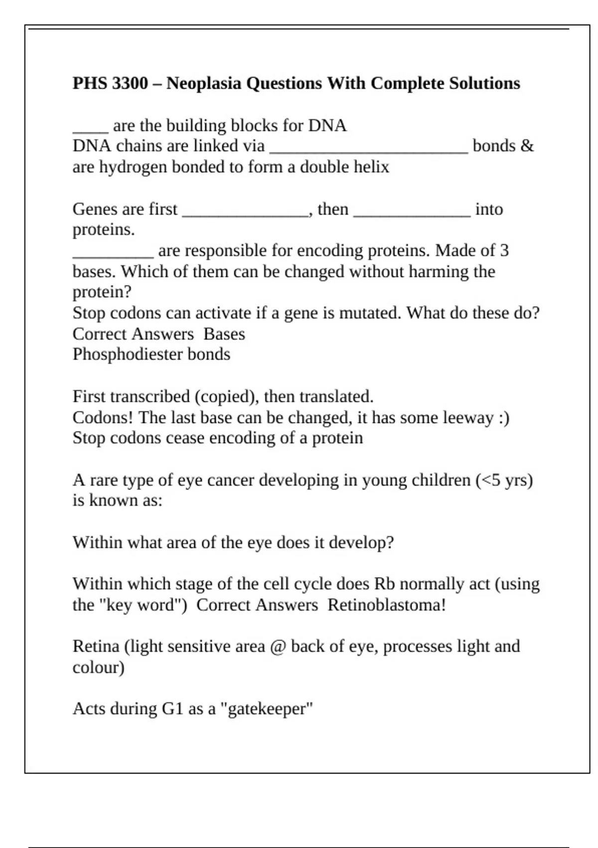 PHS 3300 – Neoplasia Questions With Complete Solutions
