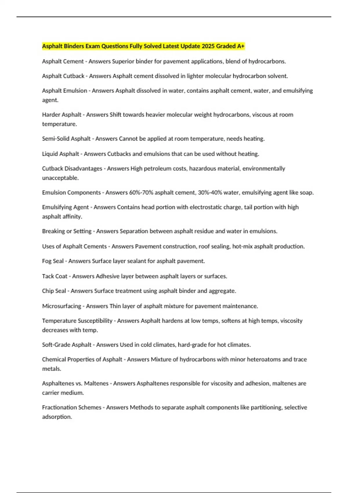 Asphalt Binders Exam Questions Fully Solved Latest Update 2025 Graded A+ Asphalt Cement - Answers Superior binder for pavement applications, blend of hydrocarbons. Asphalt Cutback - Answers Asphalt cement dissolved in lighter molecular hydrocarbon solvent. Asphalt Emulsion - Answers Asphalt dissolved in water, contains asphalt cement, water, and emulsifying agent. Harder Asphalt - Answers Shift towards heavier molecular weight hydrocarbons, viscous at room temperature. Semi-Solid Asphalt - Answers Cannot be applied at room temperature, needs heating. Liquid Asphalt - Answers Cutbacks and emulsions that can be used without heating. Cutback Disadvantages - Answers High petroleum costs, hazardous material, environmentally unacceptable. Emulsion Components - Answers 60%-70% asphalt cement, 30%-40% water, emulsifying agent like soap. Emulsifying Agent - Answers Contains head portion with electrostatic charge, tail portion with high asphalt affinity. Breaking or Setting - Answers Separation between asphalt residue and water in emulsions. Uses of Asphalt Cements - Answers Pavement construction, roof sealing, hot-mix asphalt production. Fog Seal - Answers Surface layer sealant for asphalt pavement. Tack Coat - Answers Adhesive layer between asphalt layers or surfaces. Chip Seal - Answers Surface treatment using asphalt binder and aggregate. Microsurfacing - Answers Thin layer of asphalt mixture for pavement maintenance. Temperature Susceptibility - Answers Asphalt hardens at low temps, softens at high temps, viscosity decreases with temp. Soft-Grade Asphalt - Answers Used in cold climates, hard-grade for hot climates. Chemical Properties of Asphalt - Answers Mixture of hydrocarbons with minor heteroatoms and trace metals. Asphaltenes vs. Maltenes - Answers Asphaltenes responsible for viscosity and adhesion, maltenes are carrier medium. Fractionation Schemes - Answers Methods to separate asphalt components like partitioning, selective adsorption.