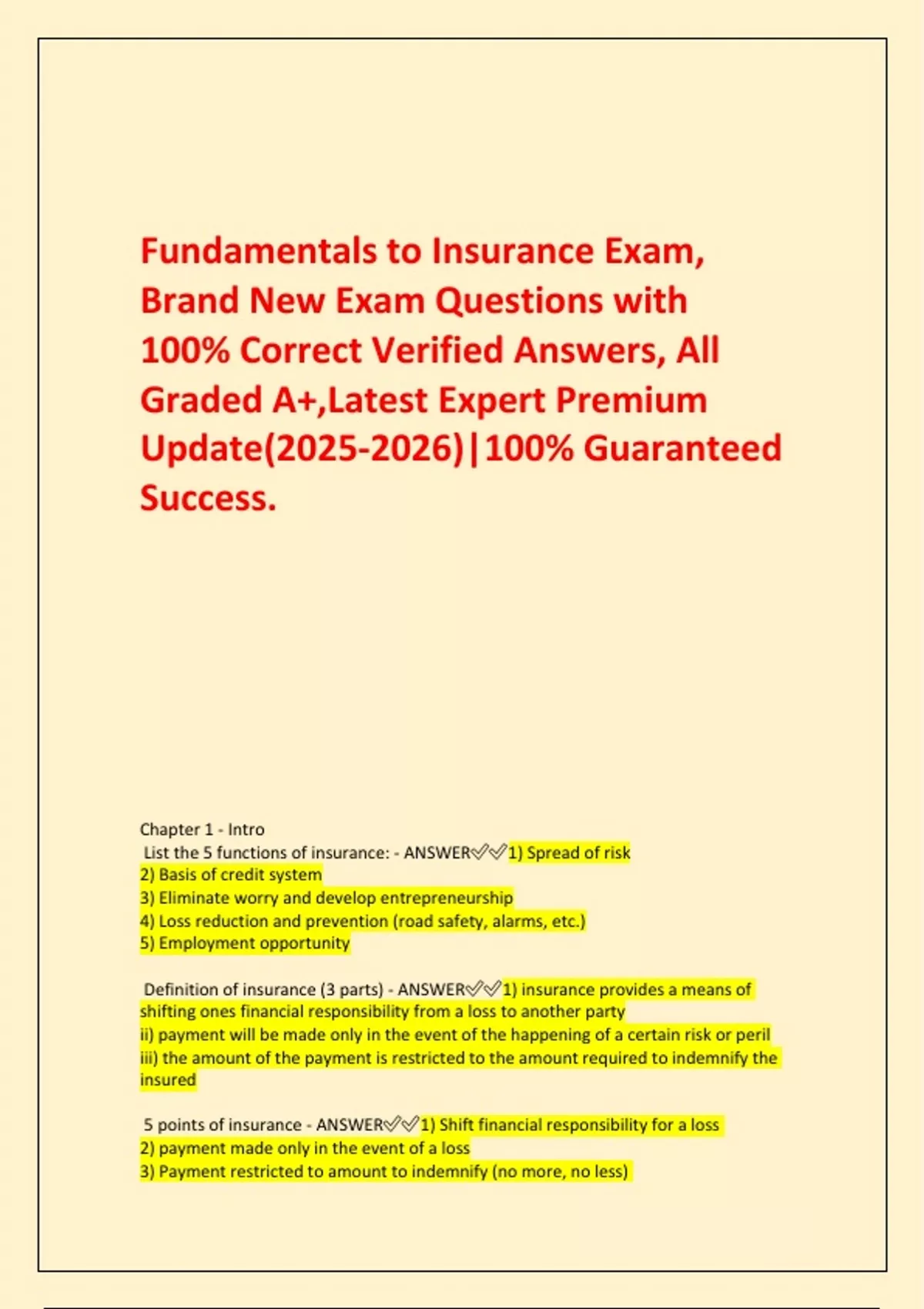 Major function of insurance is to: - ANSWER✅✅Share losses of the few among the