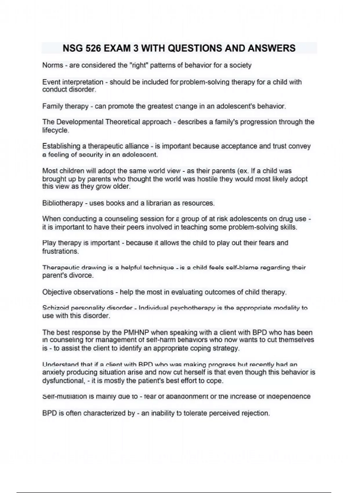 Norms - are considered the "right" patterns of behavior for a society Event interpretation - should be included for problem-solving therapy for a child with conduct disorder. Family therapy - can promote the greatest change in an adolescent's behavior. The Developmental Theoretical approach - describes a family's progression through the lifecycle. Establishing a therapeutic alliance - is important because acceptance and trust convey a feeling of security in an adolescent. Most children will adopt the same world view - as their parents (ex. If a child was brought up by parents who thought the world was hostile they would most likely adopt this view as they grow older. Bibliotherapy - uses books and a librarian as resources. When conducting a counseling session for a group of at risk adolescents on drug use - it is important to have their peers involved in teaching some problem-solving skills. Play therapy is important - because it allows the child to play out their fears and frustrations. Therapeutic drawing is a helpful technique - is a child feels self-blame regarding their parent's divorce. Objective observations - help the most in evaluating outcomes of child therapy. Schizoid personality disorder - Individual psychotherapy is the appropriate modality to use with this disorder. The best response by the PMHNP when speaking with a client with BPD who has been in counseling for management of self-harm behaviors who now wants to cut themselves is - to assist the client to identify an appropriate coping strategy. Understand that if a client with BPD who was making progress but recently had an anxiety producing situation arise and now cut herself is that even though this behavior is dysfunctional, - it is mostly the patient's best effort to cope. Self-mutilation is mainly due to - fear of abandonment or the increase of independence BPD is often characterized by - an inability to tolerate perceived rejection. Patients will respond better to limit setting if - the PMHNP can reflect back to the client an understanding and validation of their emotional distress. Clients with BPD have not successfully achieved - the developmental stage of separation-individuation. Paranoid Personality Disorder - do not trust others easily, and it's best to use a respectful neutral approach. Paranoid Personality Disorder are - critical of others because they project blame for their own shortcomings onto others. Self-mutilation occurs because - a client may feel that pain is better than not feeling anything, it also results from feelings of abandonment, it can be a manipulative gesture, and it is also happens when a safety plan has been put in place. DBT helps to - replace irrational thoughts. Respecting a client's boundaries - important in establishing a therapeutic relationship with a patient with BPD providing a safe environment - is the priority for any client who is a victim of a serious crime/assault MCI Expectant category - Injuries are extensive and chances of survival are unlikely even with definitive care. Persons in this group should be separated from other casualties, but not abandoned. Comfort measures should be provided when possible Black MCI CATEGORY - Unresponsive patients with penetrating head wounds, high spinal cord injuries, wounds involving multiple anatomical sites and organs, 2nd/3rd degree burns in excess of 60% of body surface area, seizures or vomiting within 24 hr after radiation exposure, profound shock with multiple injuries, agonal respirations; no pulse, no BP, pupils fixed and dilated. Mindfulness - The essential part of all skills taught in skills group are the core mindfulness skills. Mindfulness is the capacity to pay attention, non-judgmentally to the present moment. It is derived from teachings of the Buddha, the Zen tradition being perhaps one of its most well-known proponents. Mindfulness is all about living in the moment, experiencing your emotions and all your senses and being aware of them. The psych NP needs to - foster a child's healthy characteristics and existing environmental supports no matter how negative (ex a child lives in a homeless shelter). children from different cultures - develop at different rates Most psychiatric disorders in children are - multifactorial. Paranoid Personality Disorder characteristics - Characteristics: suspicious of others; fear others will exploit, harm, or deceive them; fear of confiding in others (fear personal information will be used against them); misread compliments as manipulation; hypervigilant; prone to counterattack; hostile; and aloof. Psychotic episodes may occur in times of stress. Nurses should give straightforward explanations of tests, history taking, and procedures, side effects of drugs, changes in treatment plan, and possible further procedures, to counteract client fear Narcissistic Personality Disorder - Characteristics: grandiosity, fantasies of power or brilliance, need to be admired, sense of entitlement, arrogant, patronizing, rude, overestimates self and underestimates others. This behavior covers a fragile ego. In health care setting demand the best of everything. When client is corrected, when boundaries are defined, or when limits are set on client's behavior, client feels humiliated, degraded, and empty. To lower anxiety the client may launch a counterattack. The nurse should gently help the client identify attempts to seek and become perfect, exhibit grandiose behavior, and sense of entitlement splitting - BPD A major defense is splitting (alternating between idealizing and devaluing). client schemas - cognitive therapy is the modality that prioritizes a client's schema. Schemas - stored bodies of knowledge that interact with incoming information to influence selective attention and memory search Bibliotherapy def - is an expressive therapy which involves using child and adolescent literature to help the child express feelings in a supportive environment, gain insight into feelings and behavior, and learn